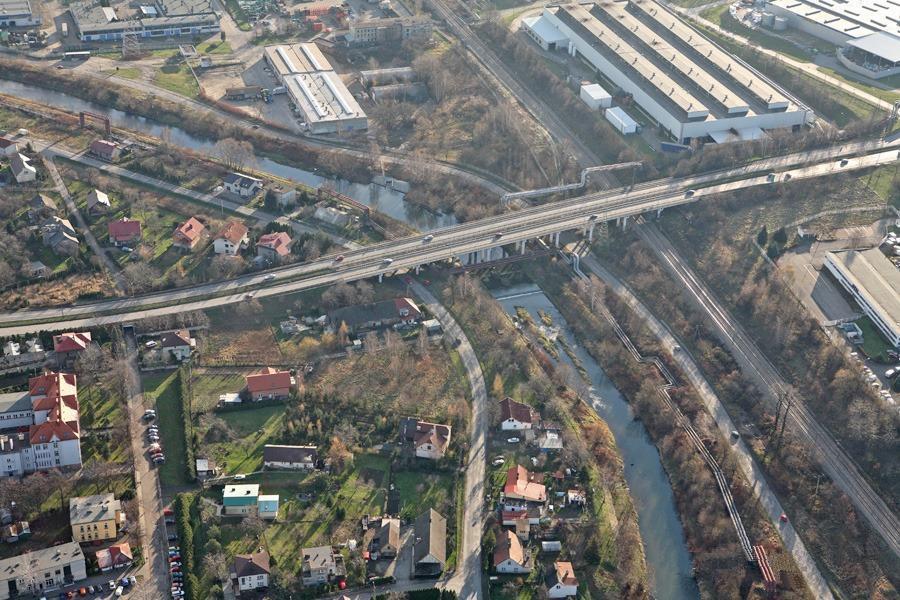 Polski: Bielsko-Biała, dzielnica Komorowice. Widok z lotu ptaka na rzekę Białą, ul. Niepodległości, linię kolejową nr 139, zakłady Fiat Auto Poland i osiedle domów jednorodzinnych. |