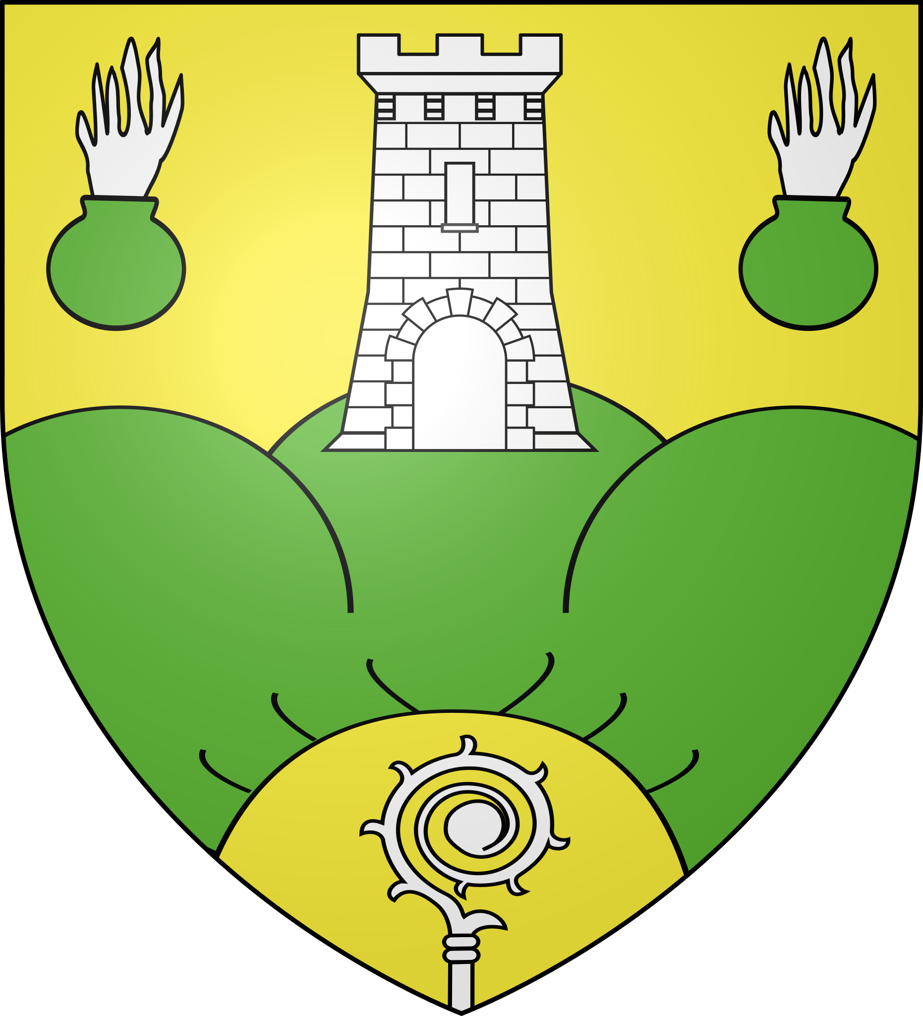 D'or à la tour d'argent posée sur une nuée de sinople en arc de cercle, accompagnée en chef de deux grenades du même, enflammées d'argent, et en pointe d'une crosse contournée d'argent mouvant de la pointe.