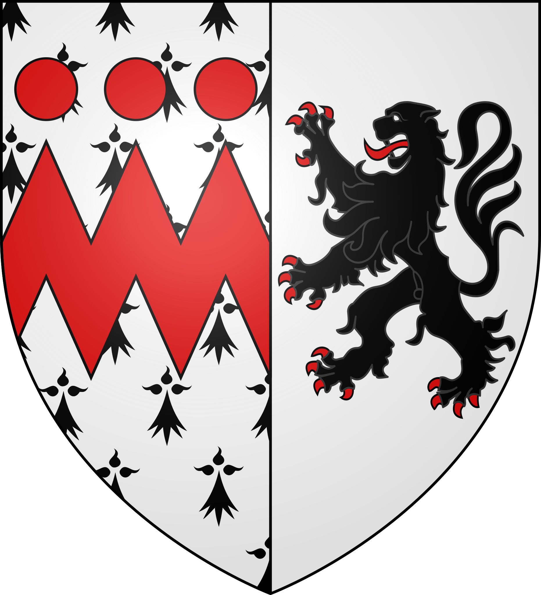 Français : blason de la commune de Dozulé, Calvados, france : parti : au premier d'hermine à la fasce vivrée de gueules surmontée de trois tourteaux du même rangés en chef, au second d'argent au lion de sable armé et lampassé de gueules |