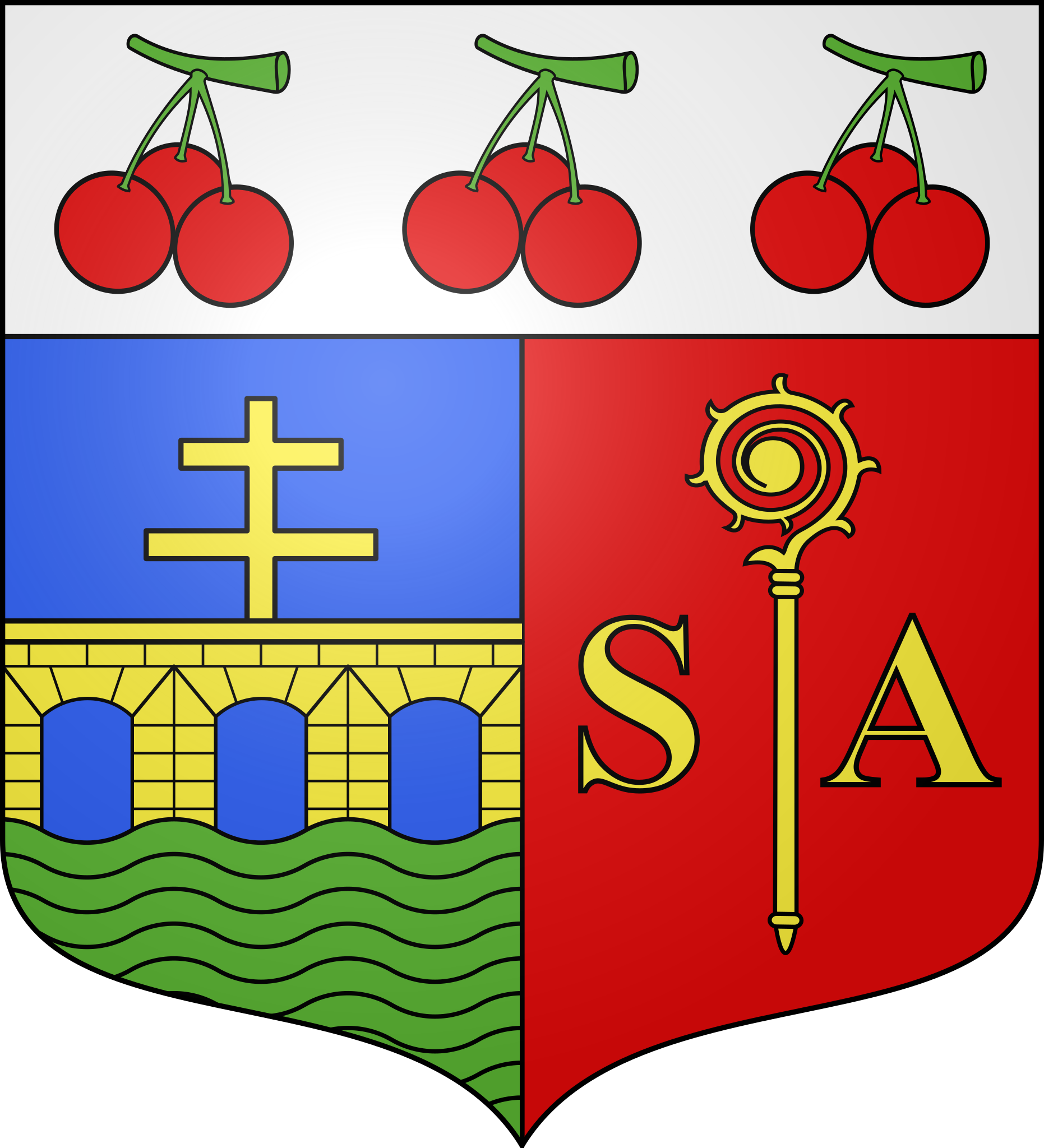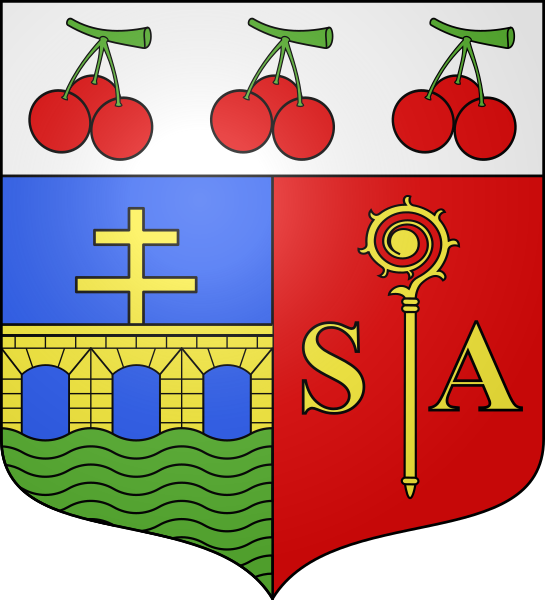 Français : blason de la commune de Saint-Aubin-lès-Elbeuf, seine maritime, france : Parti : au 1) d’azur au pont de trois arches d’or sommé d’une croix patriarcale du même et posé sur une riviére de sinople, au 2) de gueules à la crosse d’argent accostée des lettre S et A capitales du même ; le tout sommé d’un chef d’argent chargé de trois grappes de trois cerises au naturel.