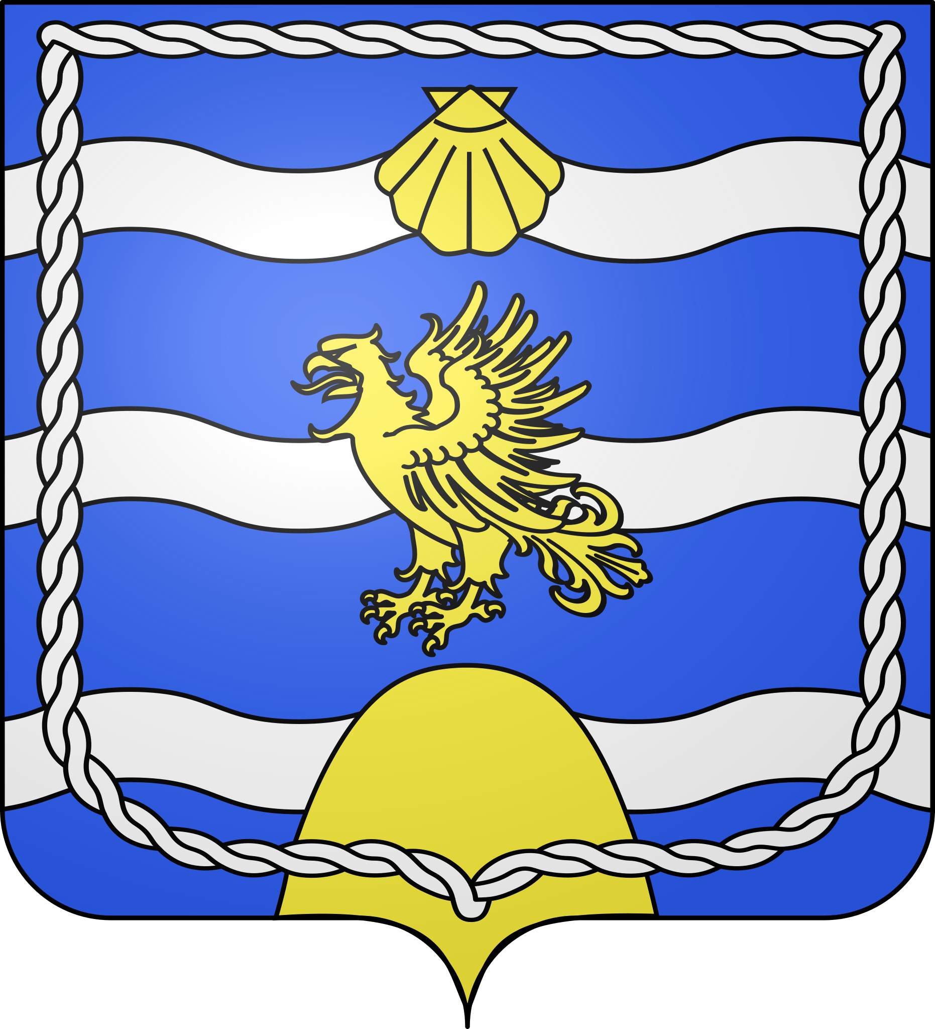 Français : D'azur à trois trangles ondées d'argent, à l'aigle essorante soutenue d'un coupeau mouvant de la pointe et surmontée d'une coquille, le tout d'or et brochant sur les trangles; à l'orle cordé d'argent brochant sur le tout. |