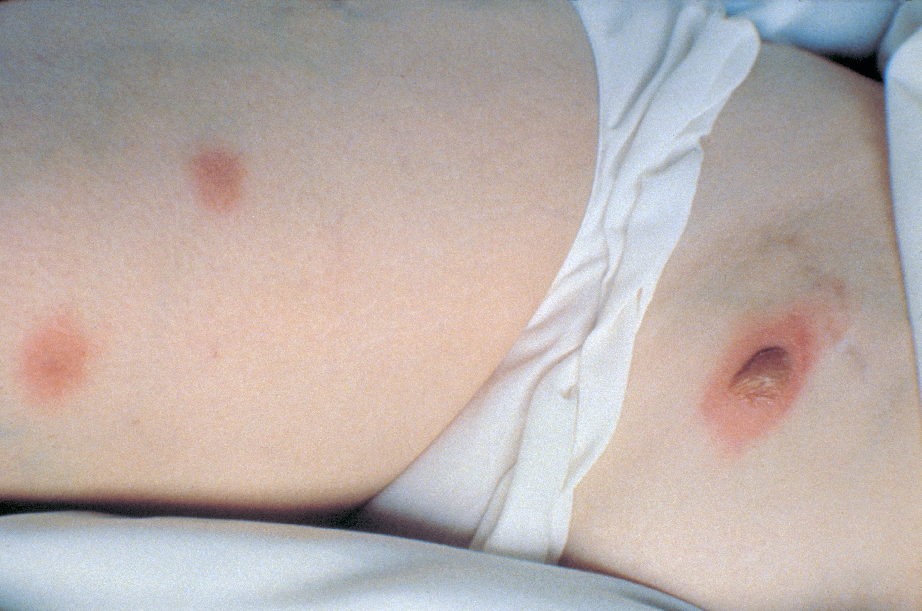 Nodular skin lesions of en:blastomycosis, one of which is a bullous lesion on top of a nodule. Source:CDC's Public Health Image Library Image #492 |