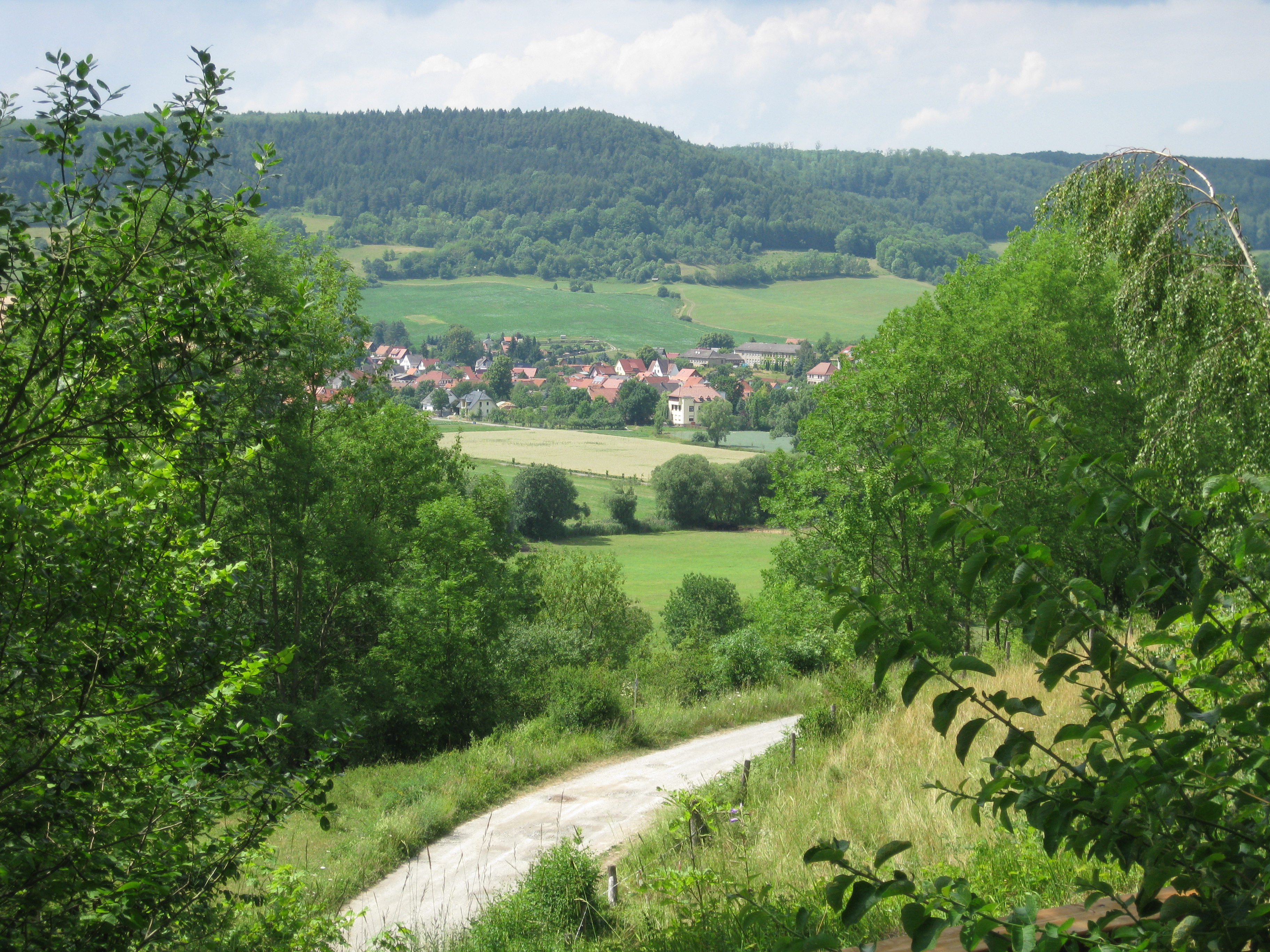 Deutsch: Blick über Großbartloff auf den Eichsfelder Westerwald (mit dem Schimberg) |