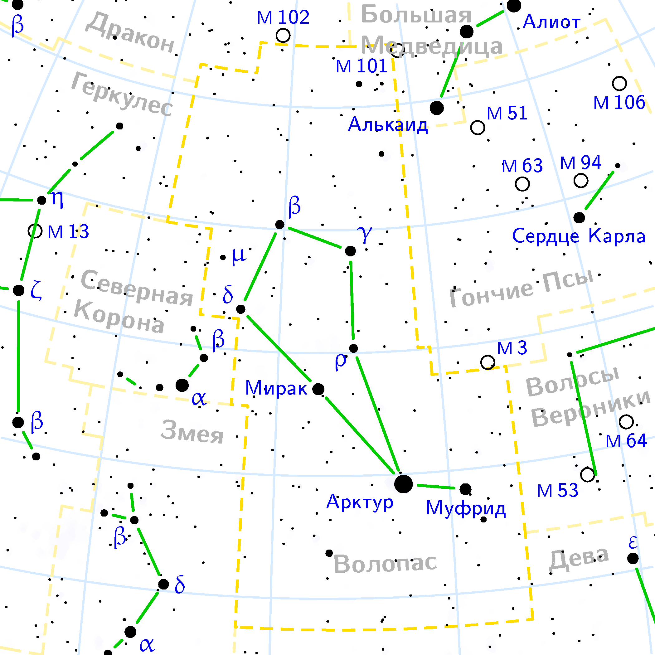 Boötes constellation map on Russian / Карта созвездия Волопаса на русском языке
