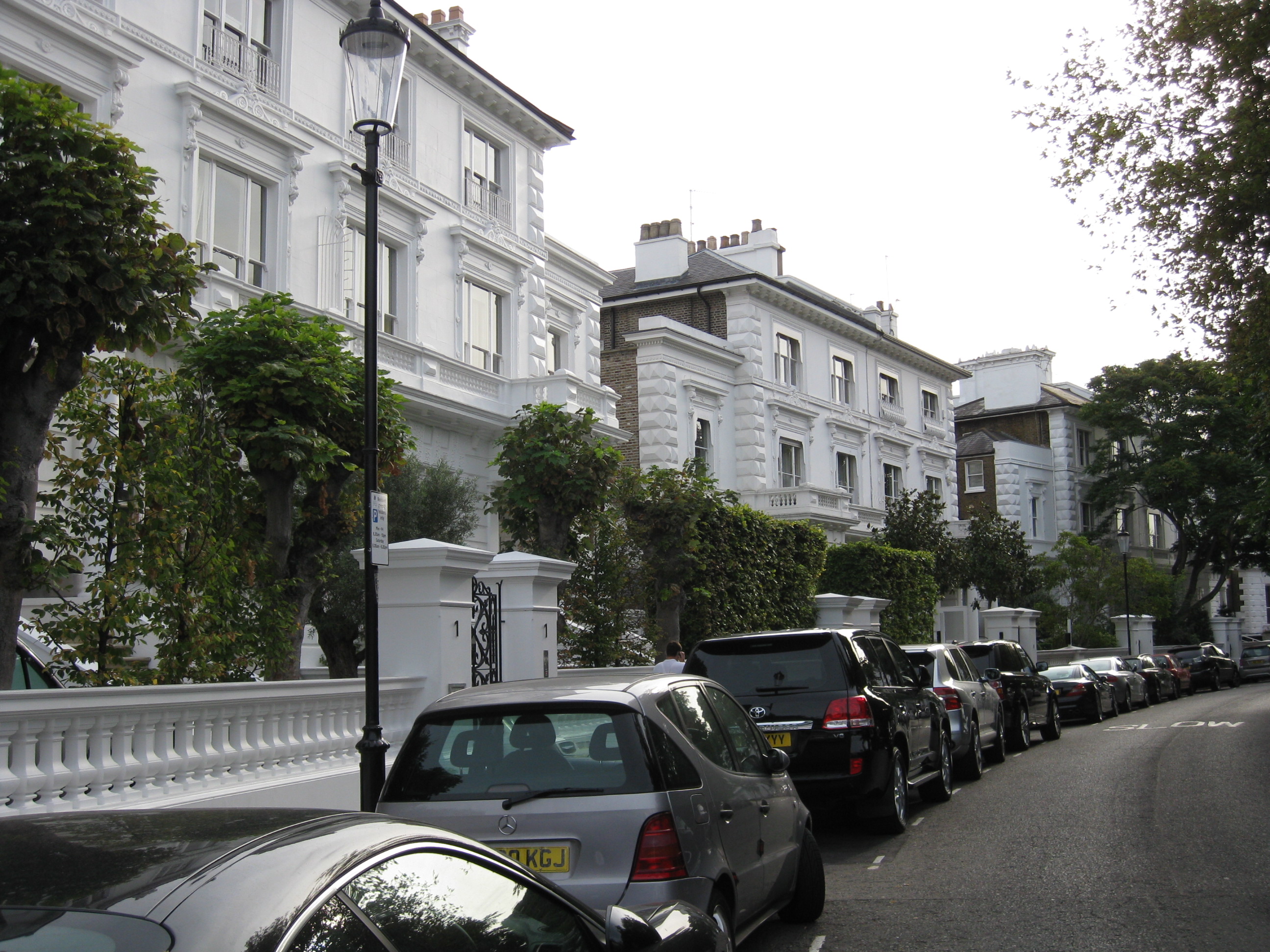 English: Houses on the West arc of the Boltons (twin crescent roads around a private communal garden) in London SW10. |