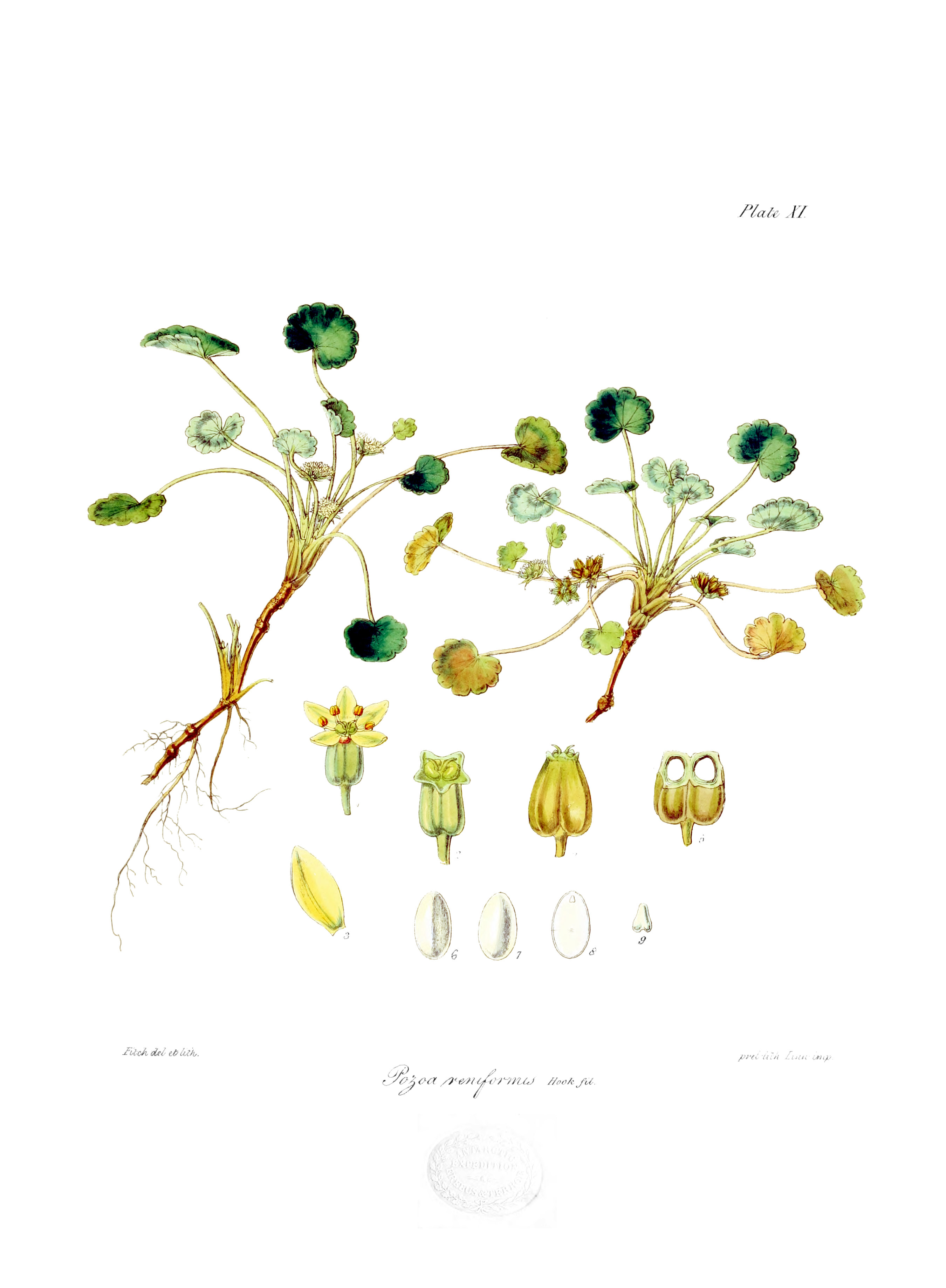 English: Plate VIII Pozoa reniformis from the Flora of Lord Auckland and Campbell's Islands |
