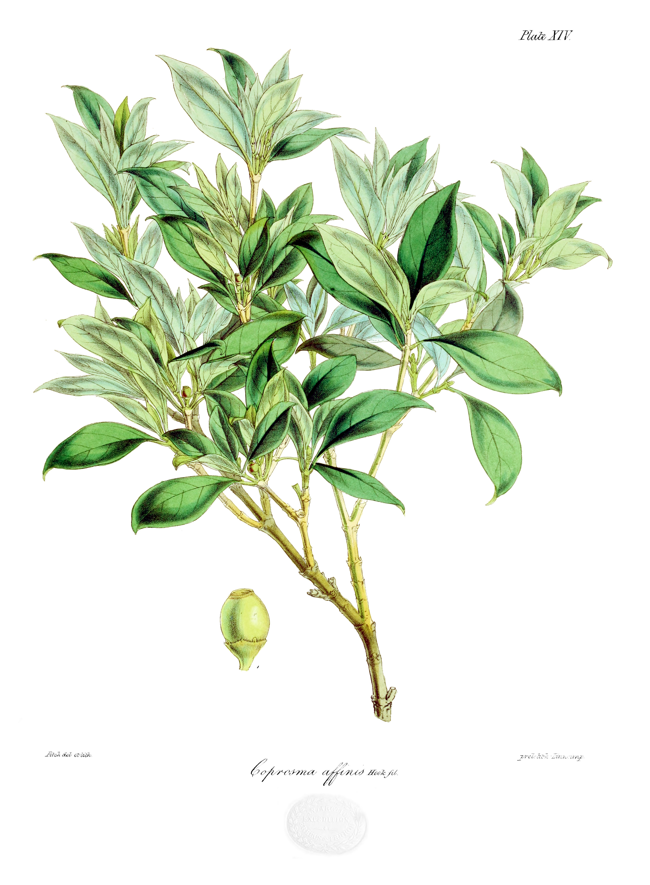 English: Plate XIV Coprosma affinis from the Flora of Lord Auckland and Campbell's Islands |