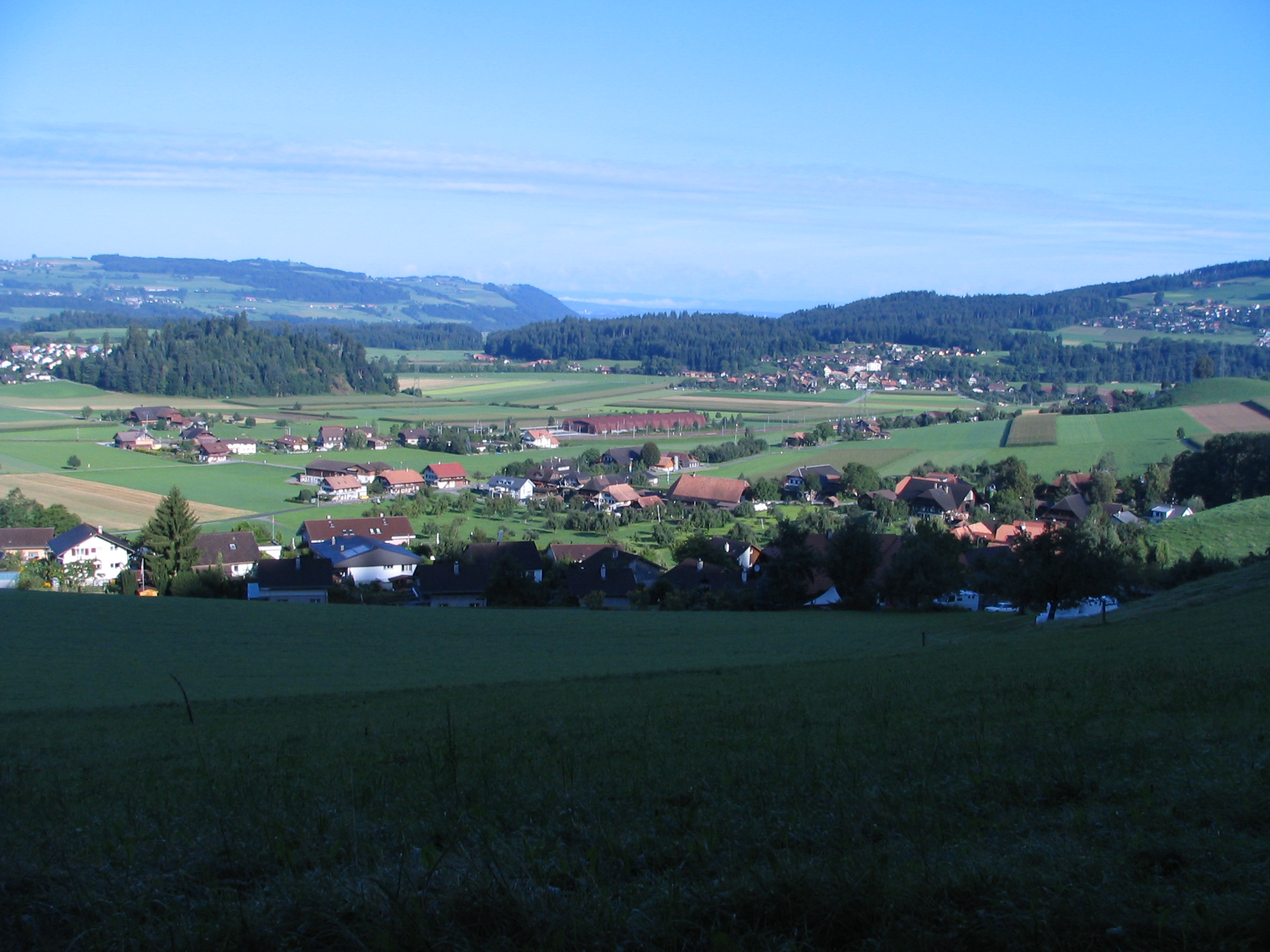 Deutsch: Brenzikofen, Dorf im Kanton Bern, Schweiz. Blick vom Hubel Richtung Nordwesten.