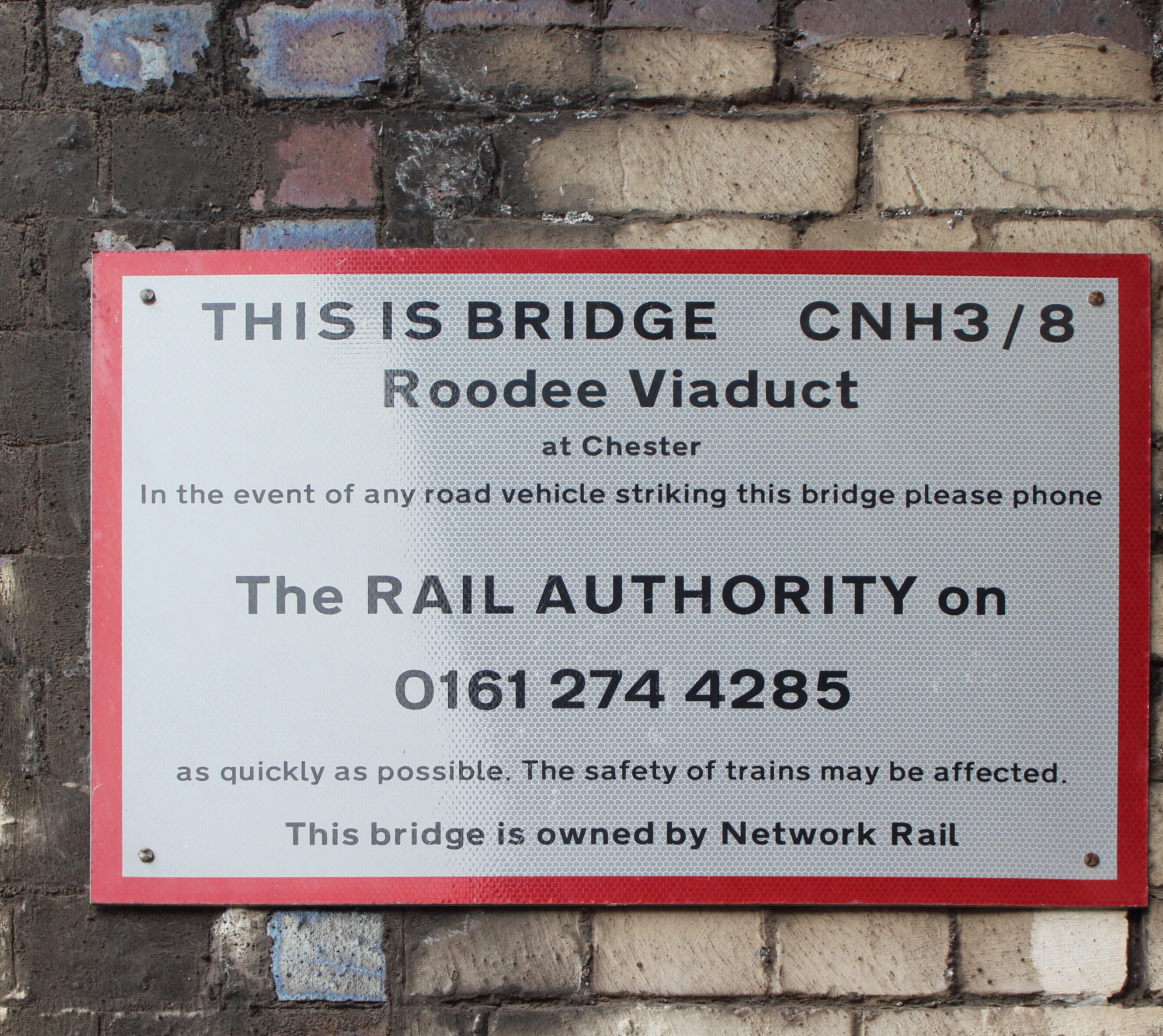 English: Plate showing name, code, distance from Euston and contact information in case of incidents. |