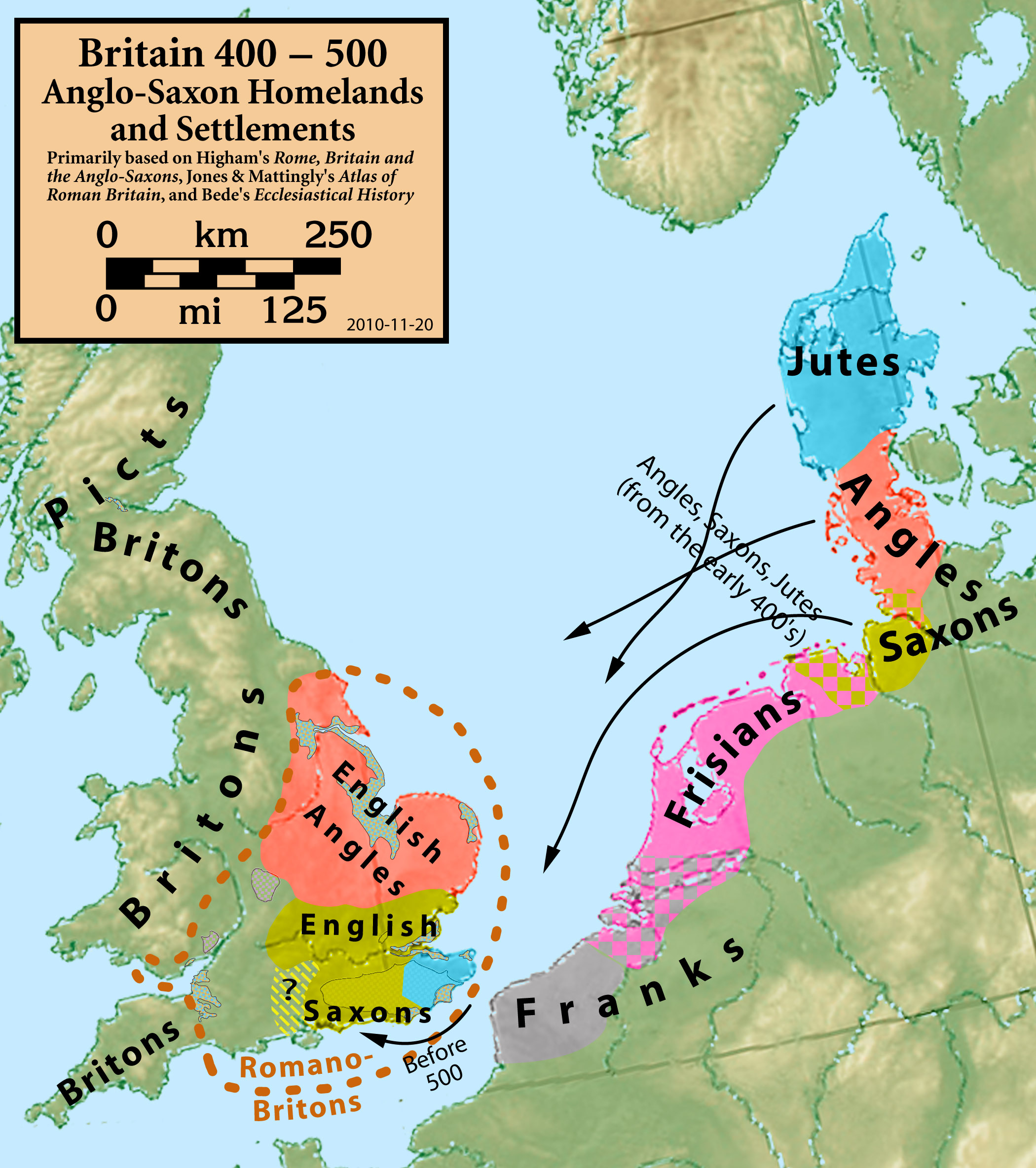 Primarily based on Bede's Ecclesiastical History (Book I, Chapter 15), giving Angle, Saxon, and Jute homelands; Jones & Mattingly's Atlas of Roman Britain (ISBN 978-1-84217-06700, 1990, reprinted 2007); and Higham's Rome, Britain and the Anglo-Saxons (ISBN 1-85264-022-7, 1992). Sources are cited in the title box.