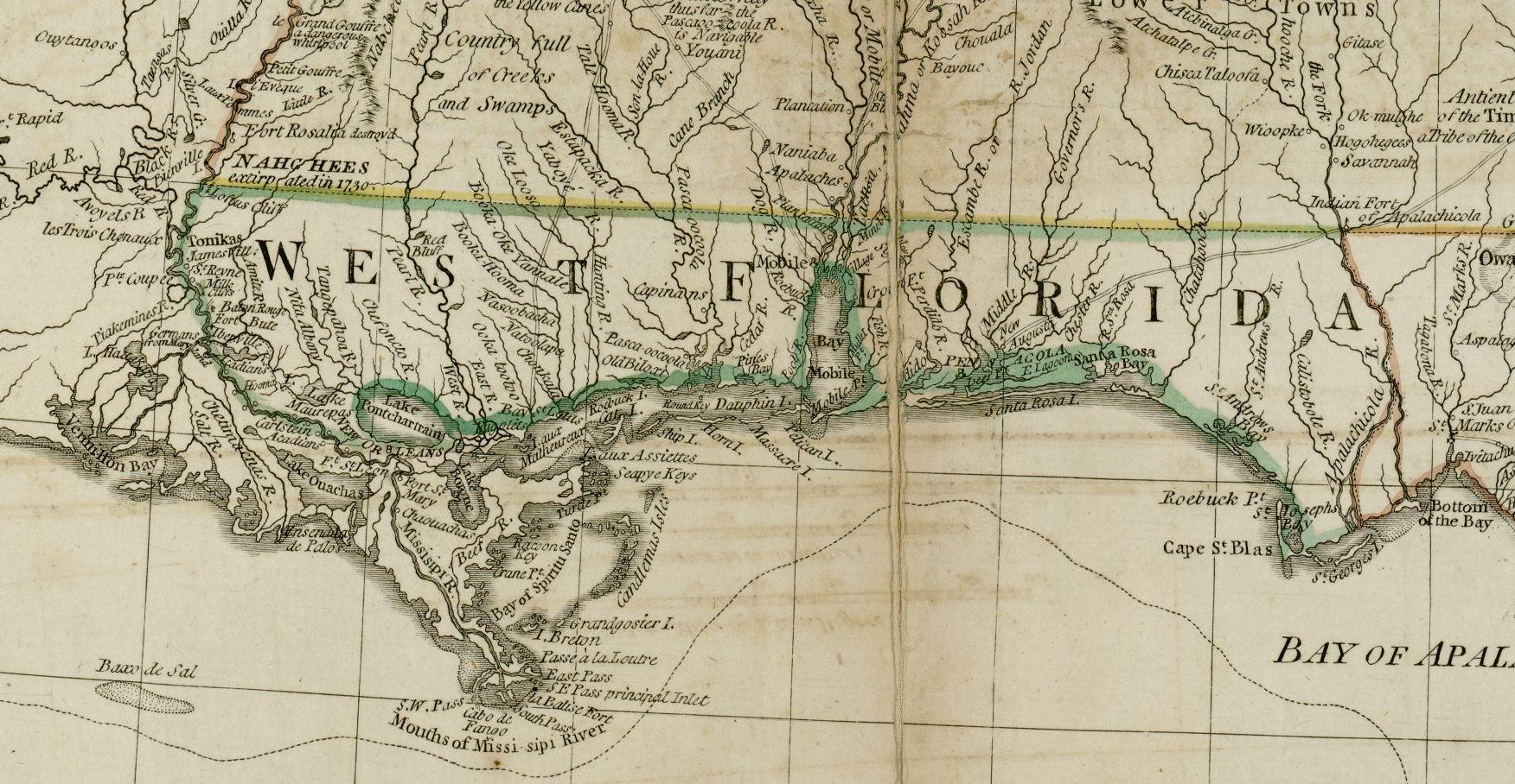 English: The source map depicts the southern British colonies in 1776, including the Carolinas, Georgia, and the Floridas, as well as labeling Indian tribal regions. This detail depicts British West Florida, roughly including the Gulf Coast between the Mississippi River and the Apalachicola River. |