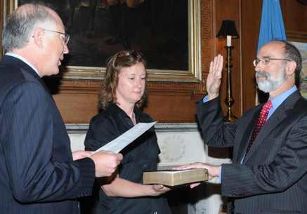 English: Secretary of the Interior Ken Salazar swears in Michael Bromwich as the new Director of the Bureau of Ocean Energy Management, Regulation, and Enforcement on June 21 as Betsy Hildebrandt, DOI Communications Director holds the Bible. |