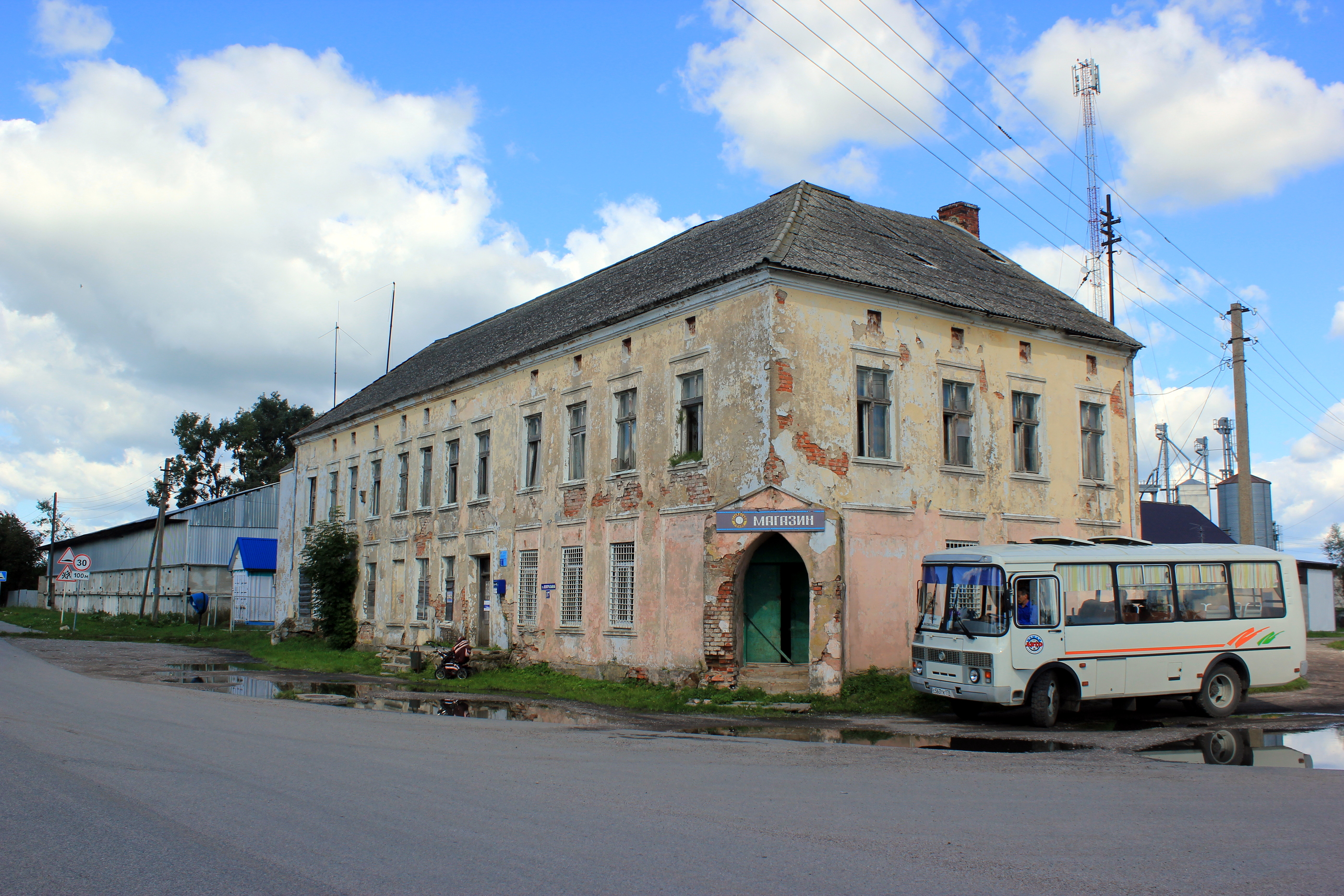 Deutsch: In Malomoschaiskoje (früher deutsch Budwethen), Oblast Kaliningrad, Russland.