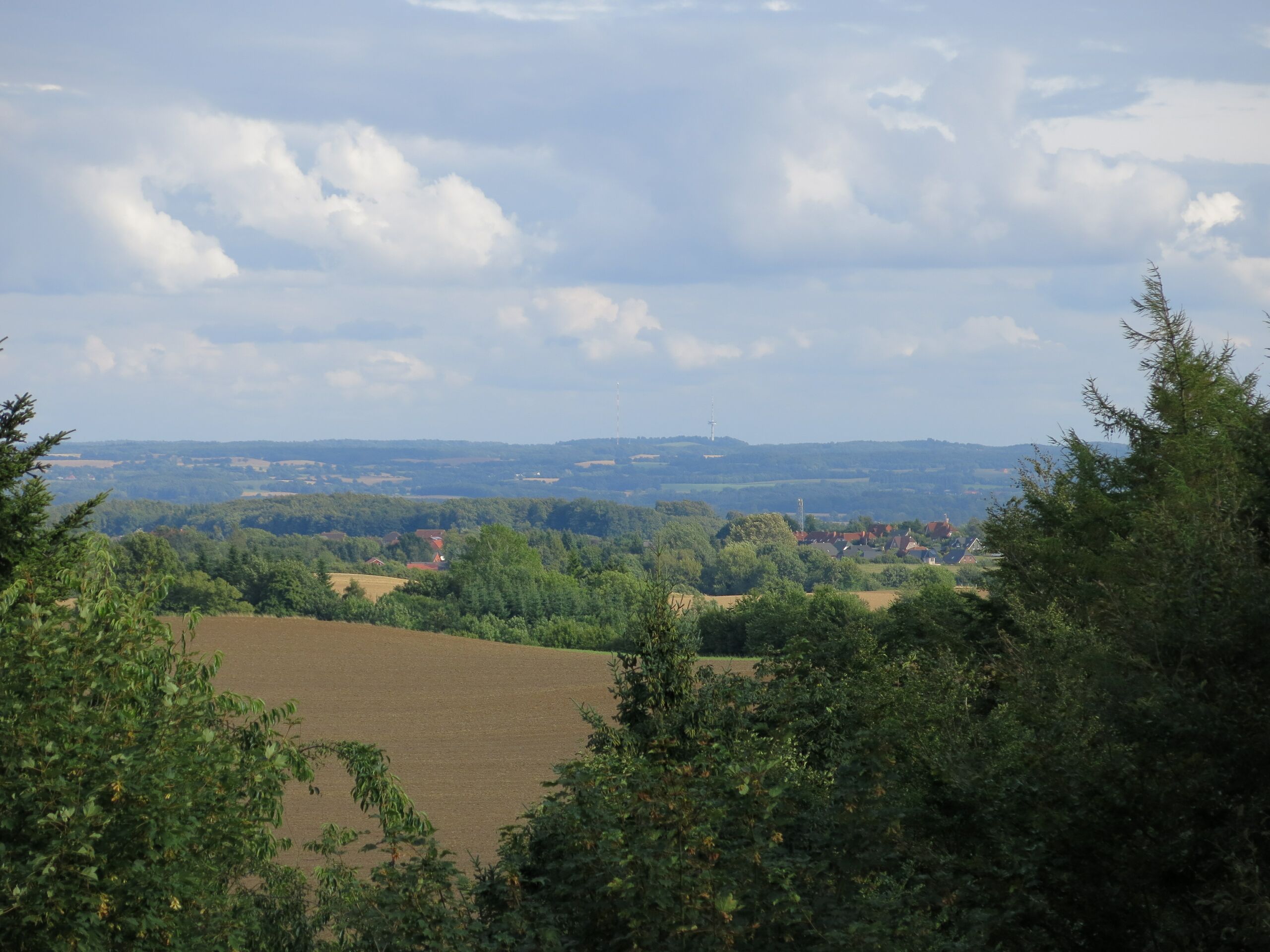 Deutsch: Der Bungsberg, höchster Berg Schleswig-Holsteins, von Nordwesten, aufgenommen vom Aussichtsturm Hessenstein auf dem Pilsberg bei Panker. |
