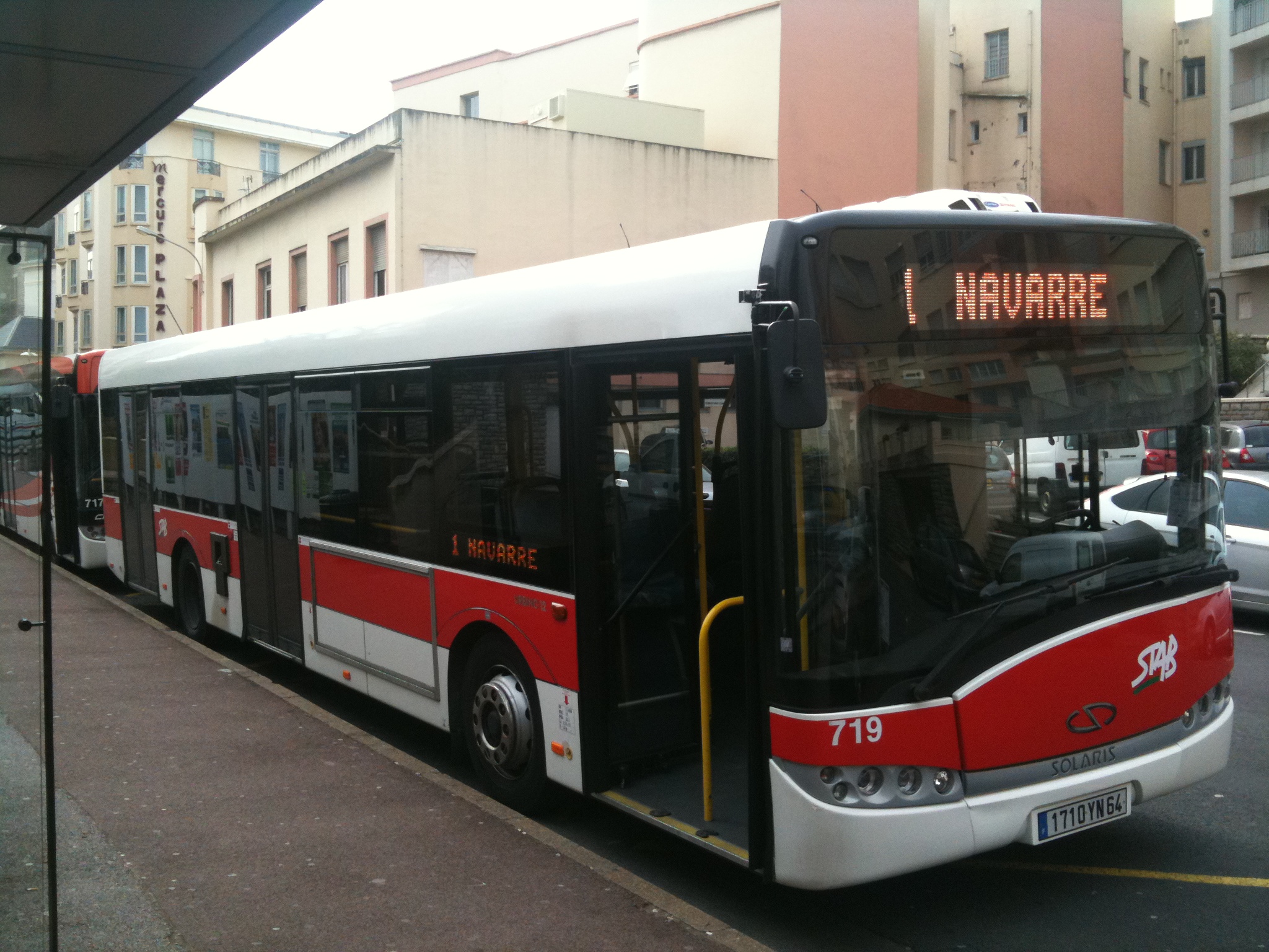 Français : Photo d'un bus du réseau STAB de Bayonne à l'arrêt "Biarritz Mairie". English: Solaris Urbino 12 bus (#719, reg. 1710 YN 64) in Biarritz, France. Built 2006, STAB Bayonne operator. |