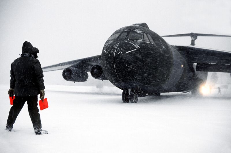 | Description | A flight line marshaler directs a camouflage-painted C-141B Starlifter aircraft to a stop during a snowy night. The aircraft is involved in exercise Alloy Express. Location: Bardufoss, Norway. |