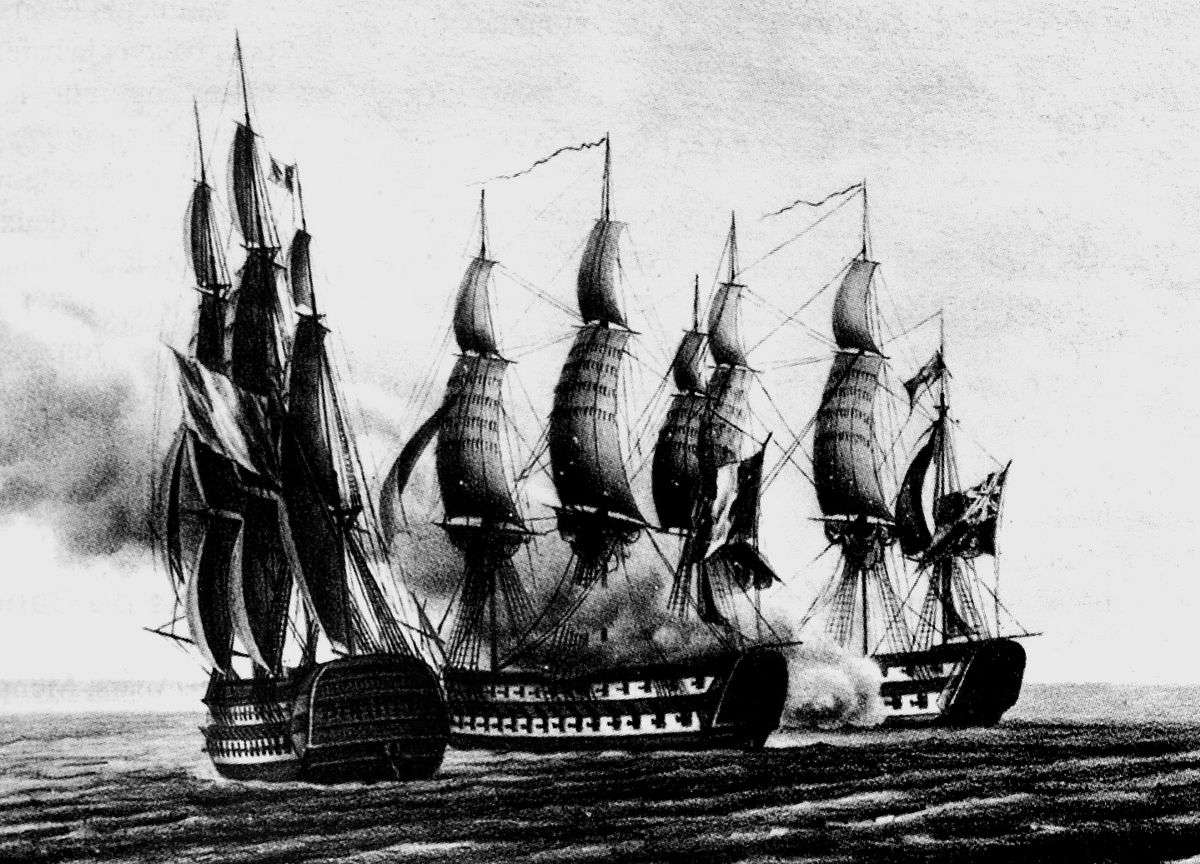 Français : En reprenant la route la France, l'Invincible et le Dix-Août de la division Ganteaume rencontrent, le 24 juin 1801, le vaisseau anglais Swifsure, vétéran de la bataille d'Aboukir, en route vers Malte. Après une sévère canonnade, l'Anglais amène ses couleurs et est capturé par les Français. |