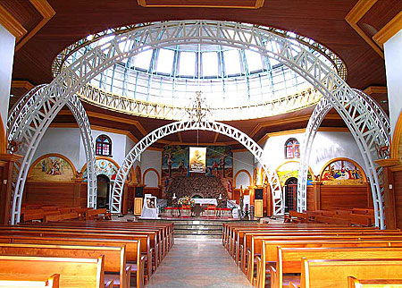 (Portuguese) English: Church interior with exposed steel arches, and dome — in Nova Veneza, Goiás, Brazil |