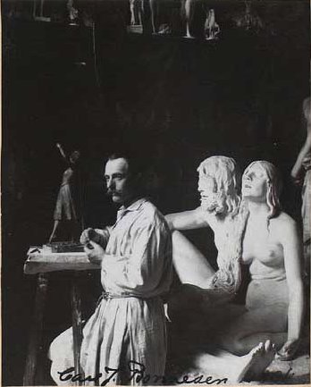 English: Carl J. Bonnesen photographed in his studio; seen in the background is the model for the group statue 'Adam og Eva ved Abels lig' (1902) for which he received the Eibeschütz Prize. It was acquired by the Danish National Gallery Museum for Kunst og placeret i anlægget foran museet.