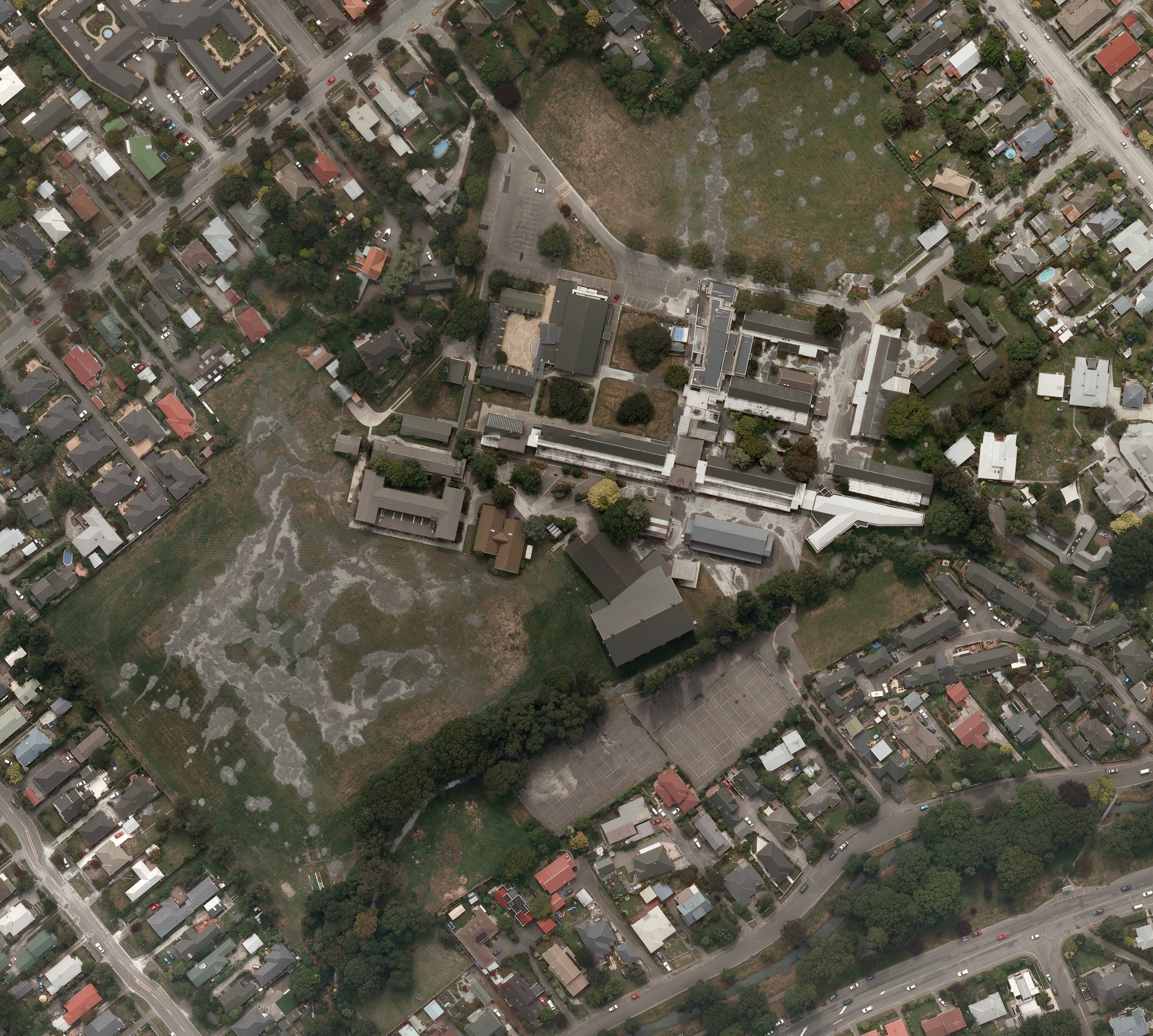 English: 10cm colour orthophotography of the area affected by the 22 February 2011 Christchurch earthquake. Note the w:soil liquefaction on the school playing fields |