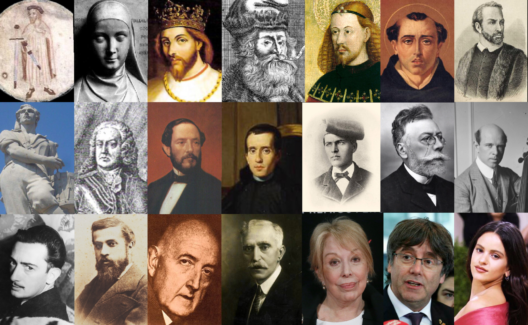 Català: Guifré el Pilós · Ermessenda de Carcassona · Jaume I · Ramon Llull · Ausiàs March · Sant Vicent Ferrer · Pau Claris · El timbaler del Bruc · Antoni de Villaroel · Joan Prim · Jaume Balmes · Jacint Verdaguer · Àngel Guimerà · Pau Casals · Salvador Dalí · Antoni Gaudí · Josep Maria de Sagarra · Francesc Macià · Rosa Maria Sardà · Carles Puigdemont · Rosalía (Rosalia Vila)