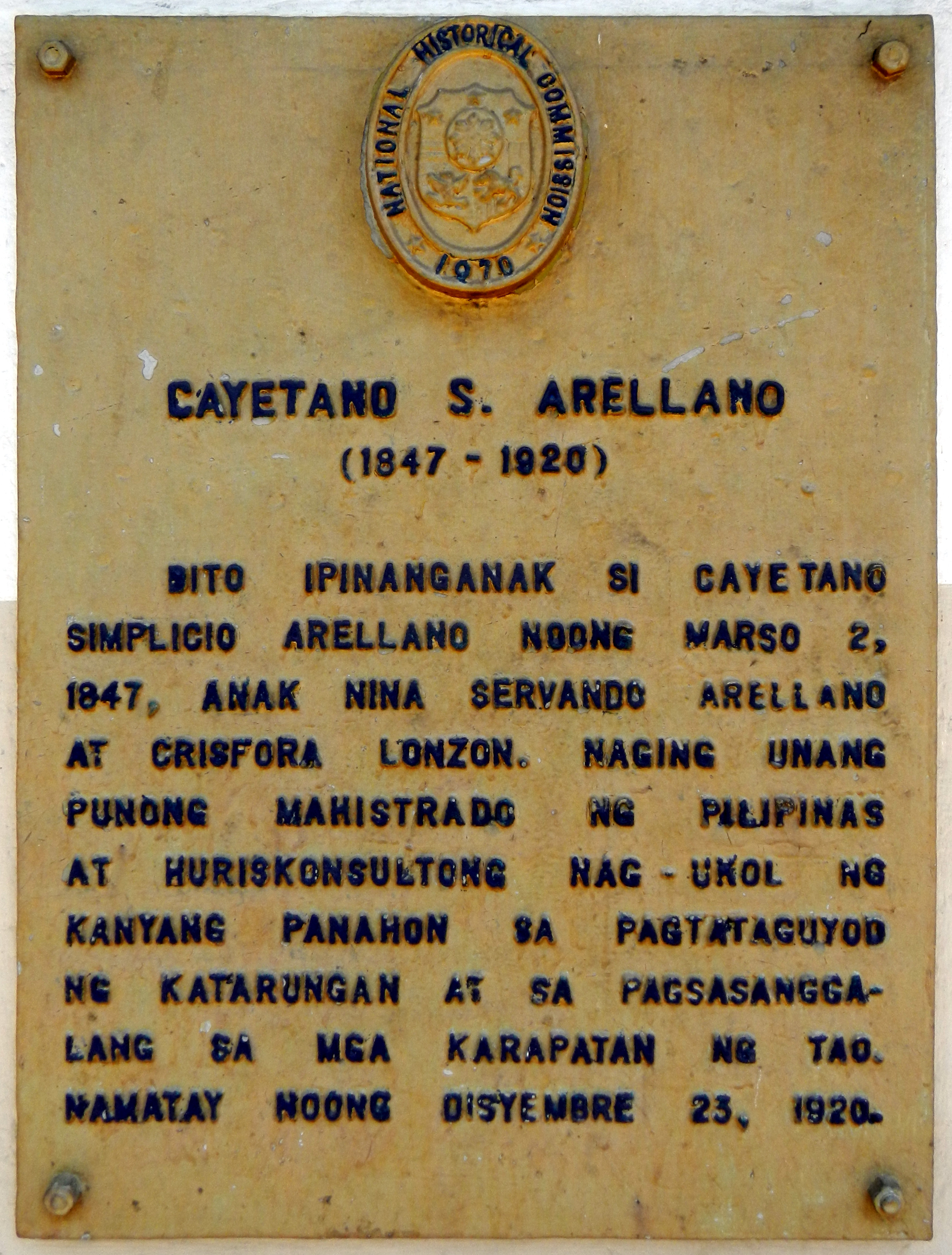 English: National Historical Commission historical marker for w:Cayetano Arellano. |