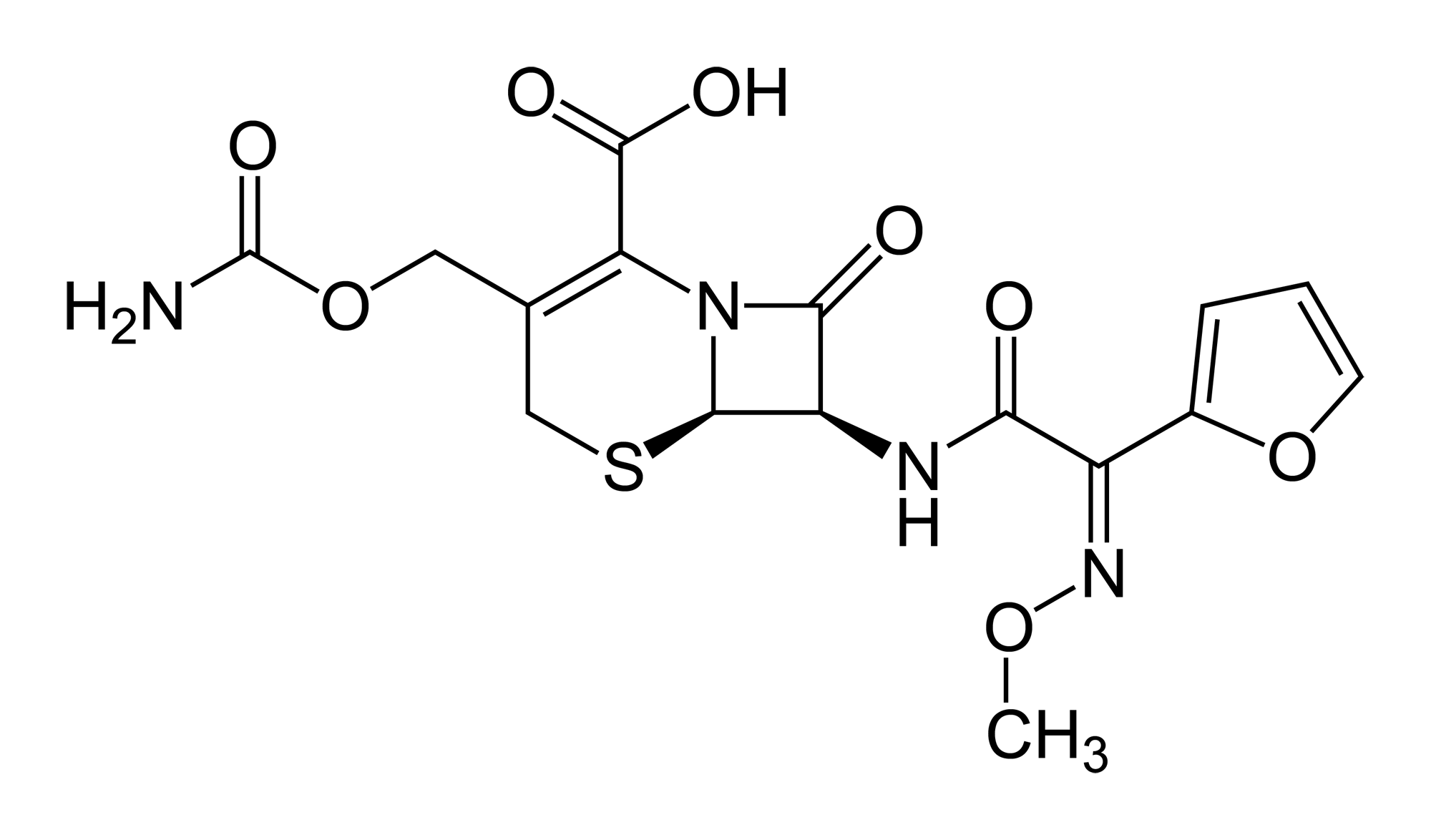 | Description | Skeletal formula of the cefuroxime molecule, C16H16N4O8S. Structure determined by X-ray crystallography in PDB 1QMF. | ||