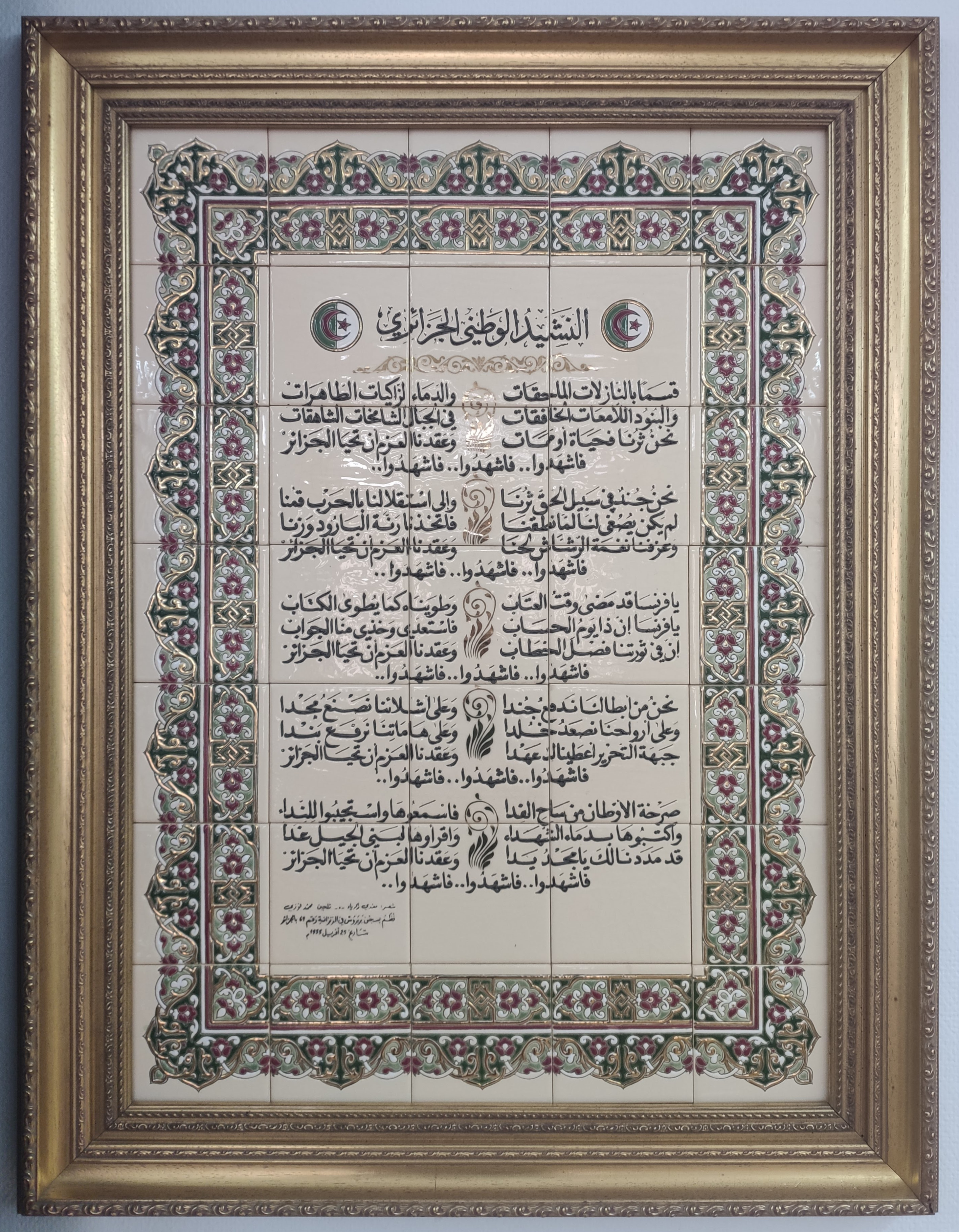 English: Ceramic Algerian anthem lyrics - Kassaman. in the interior of the Algerian embassy in Moscow.