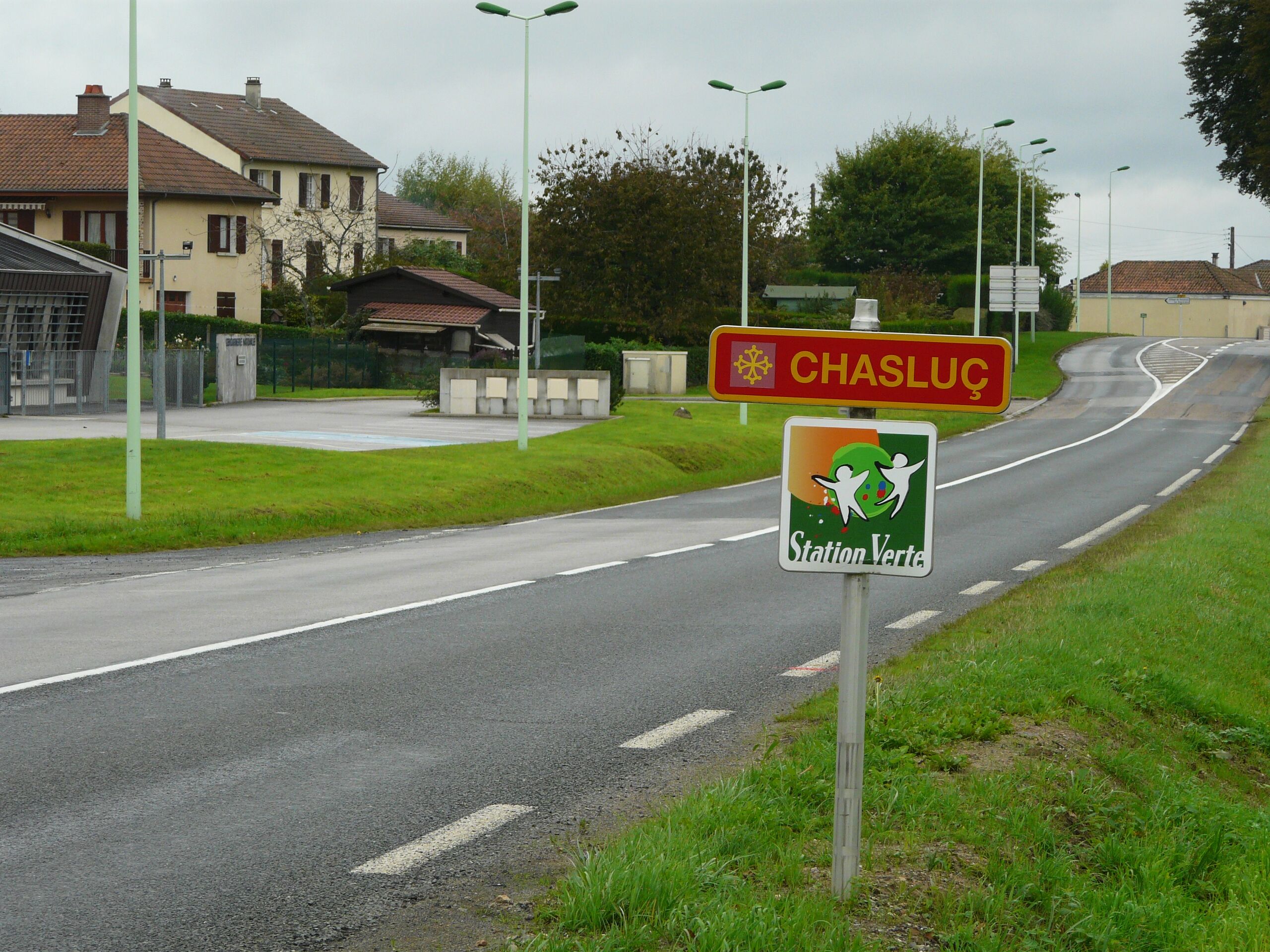 Français : Panneau d'entrée (en occitan limousin) à Châlus, Haute-Vienne, France. |