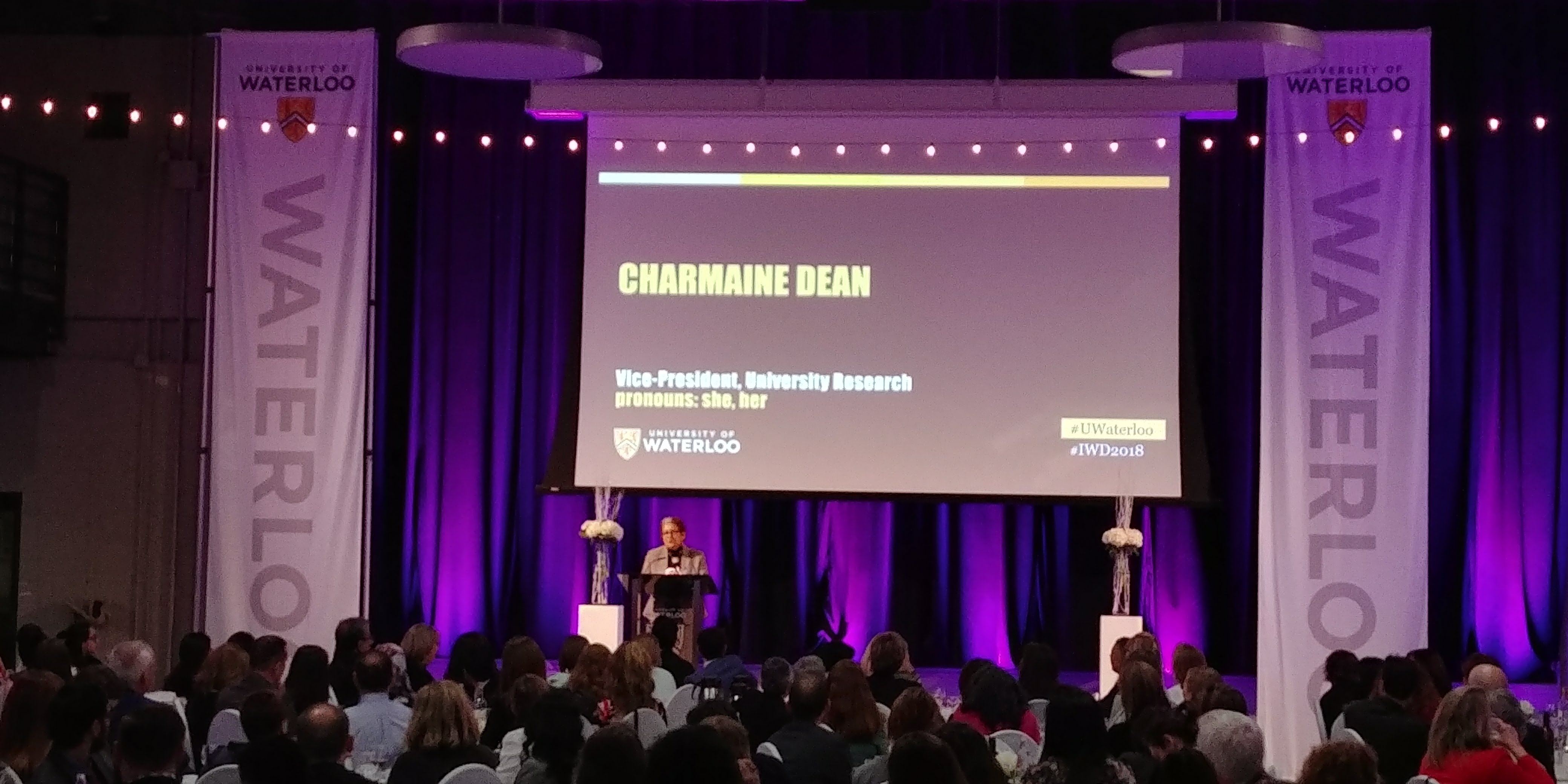 English: Charmaine Dean speaking during keynote address at University of Waterloo's International Women's Day dinner.