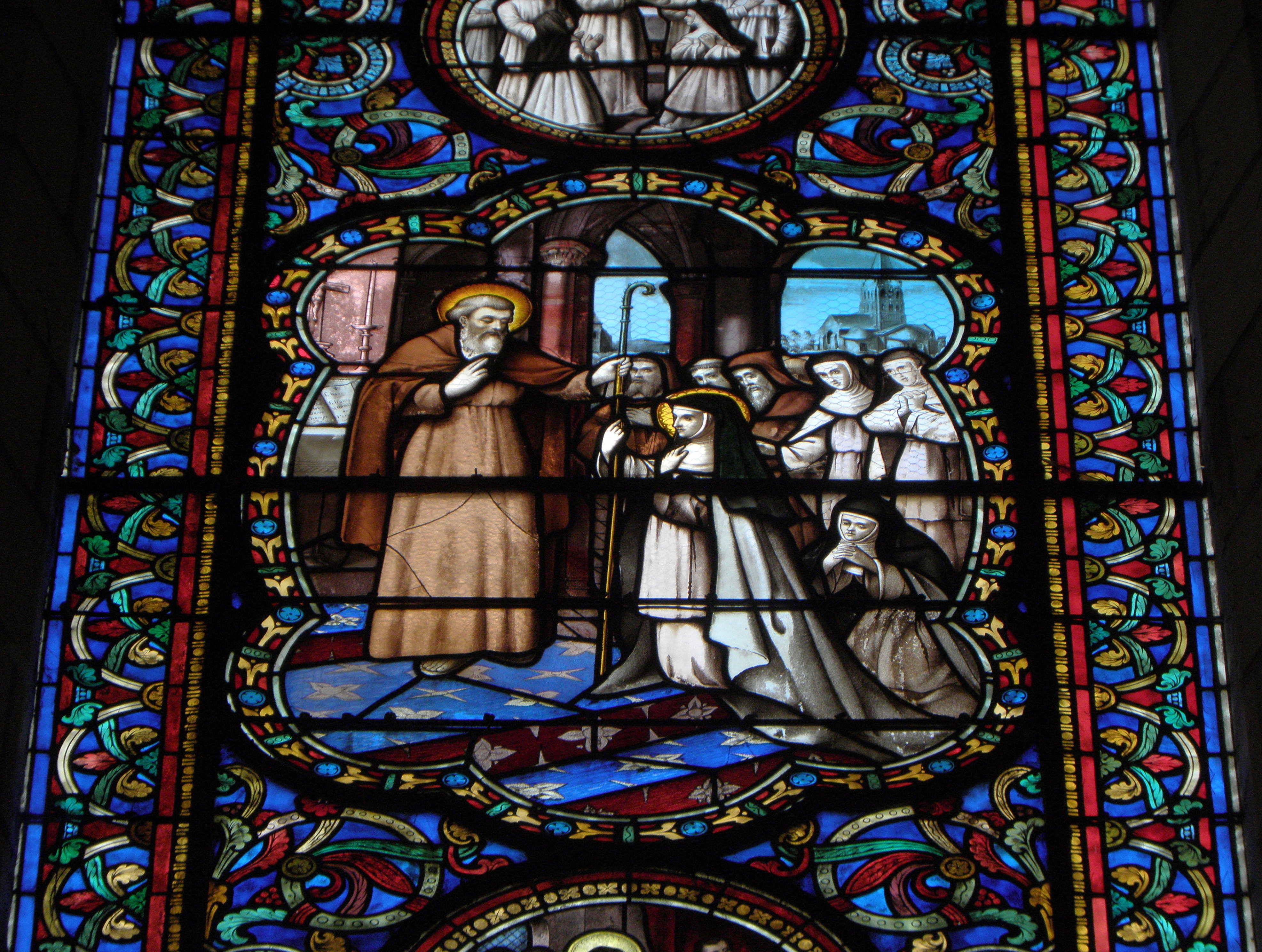 Français : Église Notre-Dame la Neuve de Chemillé-Melay (49). Baie 13. Verrière de Pétronille de Chemillé et Robert d'Arbrissel. Pétronille de Chemillé reçoit Robert d'Arbrissel en 1115 qui lui remet son bâton d'abbesse. |