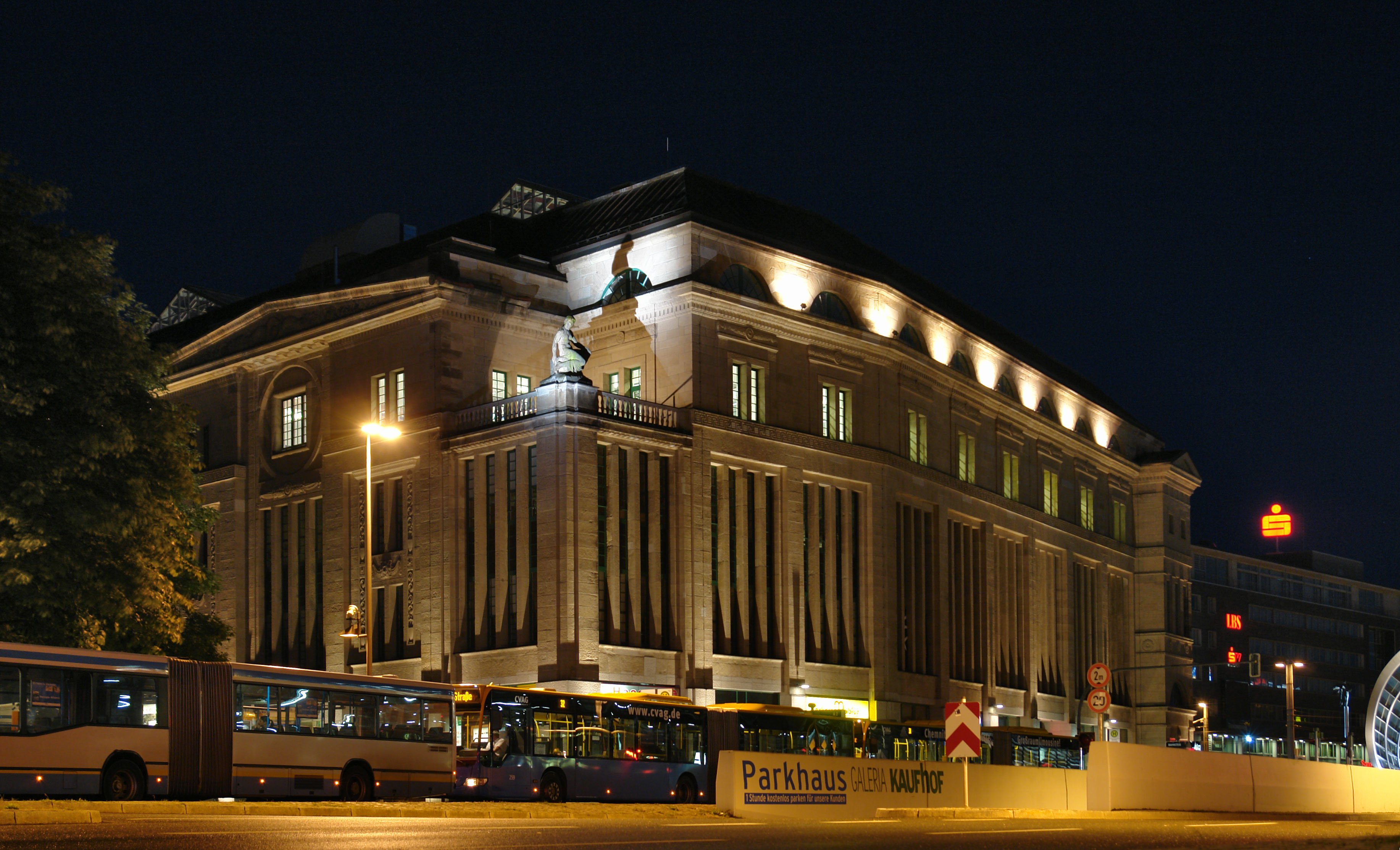 Deutsch: Tietz bei Nacht mit Skulptur „Sitzende“ von Johannes Knubel (1913), davor das «Rendezvous» der Chemnitzer Verkehrs-AG zur nächtlichen Abschlussgewährung an der Zentralhaltestelle, hier Bussteig 1 |