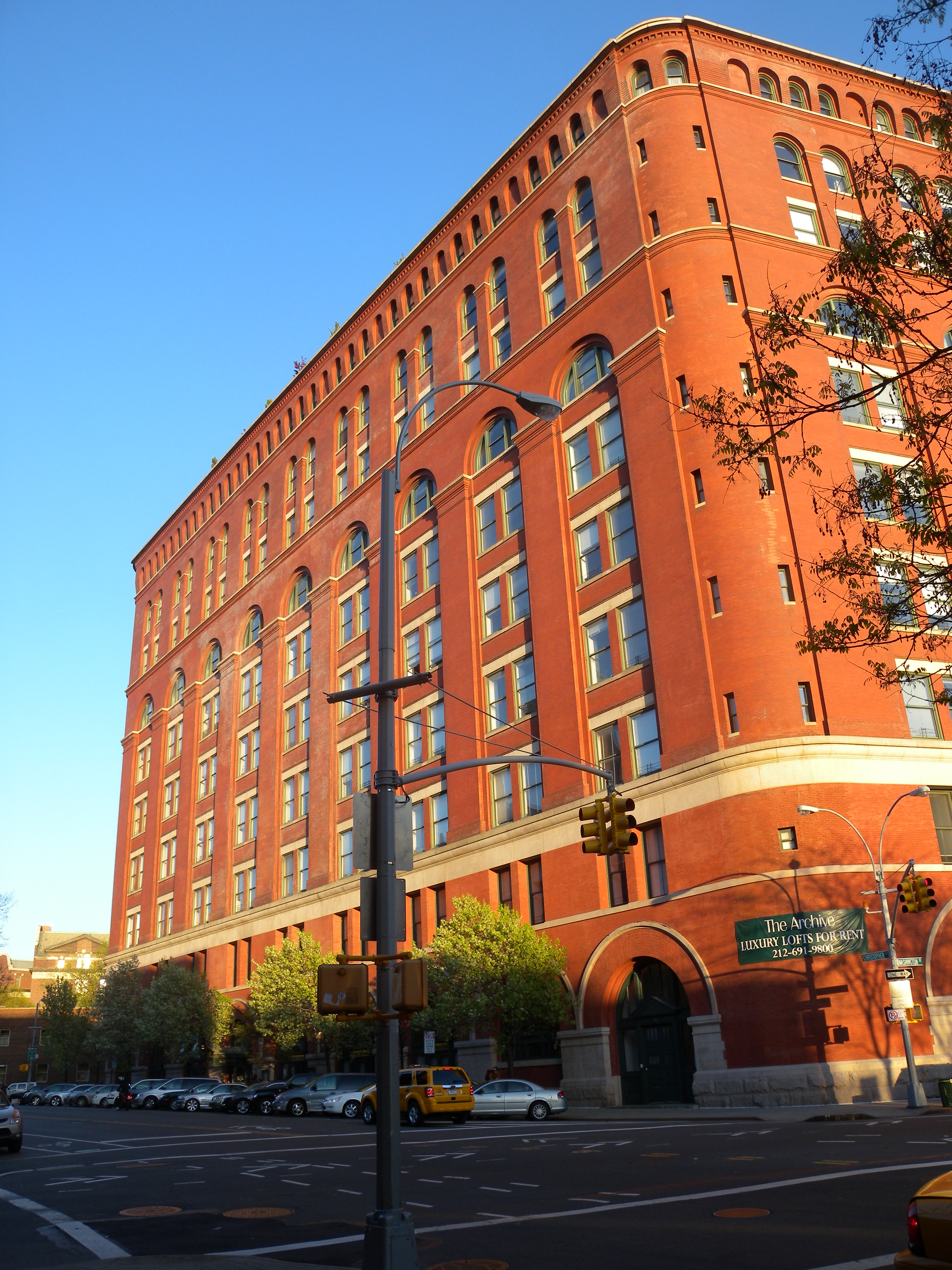 English: Looking east, shortly before sunset of a clear day, up Christopher Street and across Washington Street at the former United States Appraiser Store, later US Federal Building, used as a telephone exchange in GC Scott "They Might be Giants", now The Archive at 666 Greenwich Street, an apartment house. |