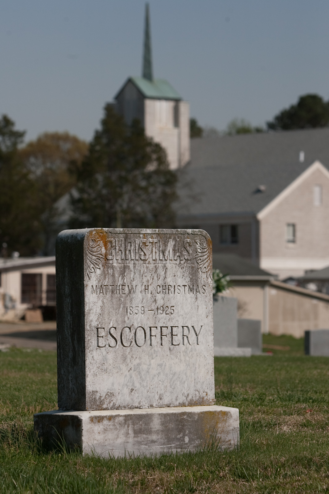 English: Beechwood Cemetery Plot of Matthew Christmas (d. 1925), with White Rock Baptist Church in background. |