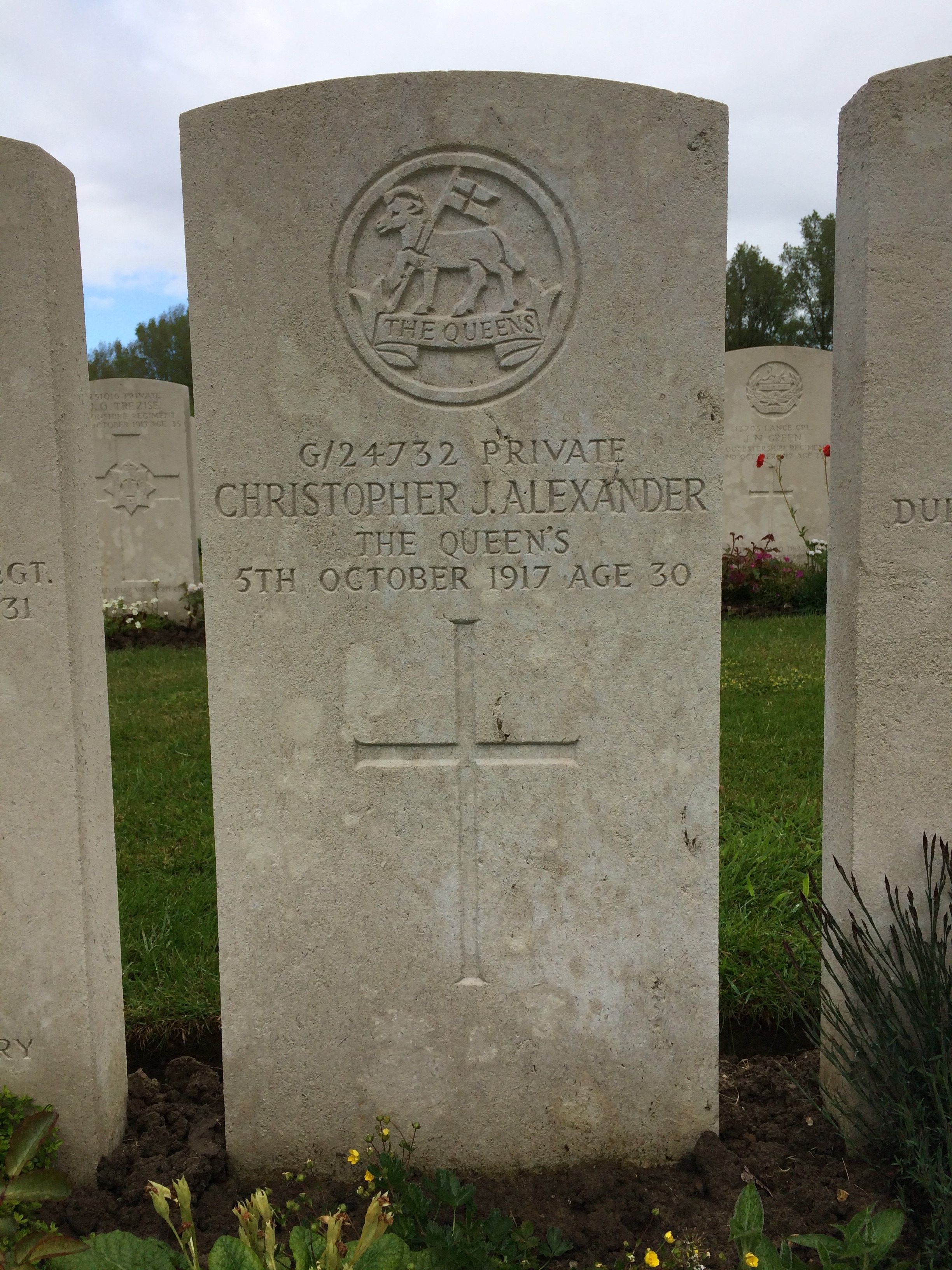 English: Christopher James Alexander's grave in Hooge Crater Cemetery. |