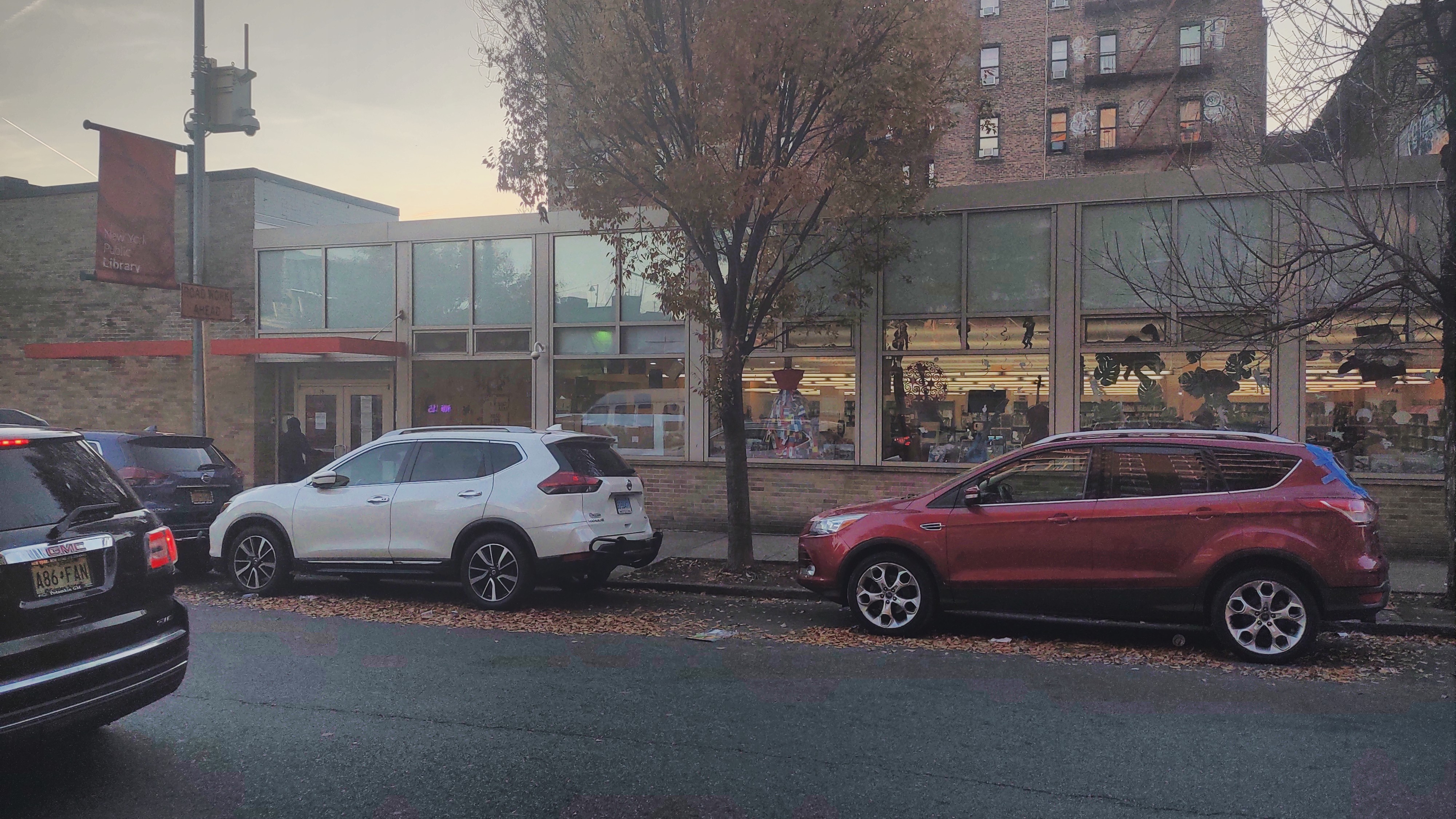 English: Looking northeast at Clason Point, Bronx Branch of NYPL at dusk of a sunny day.