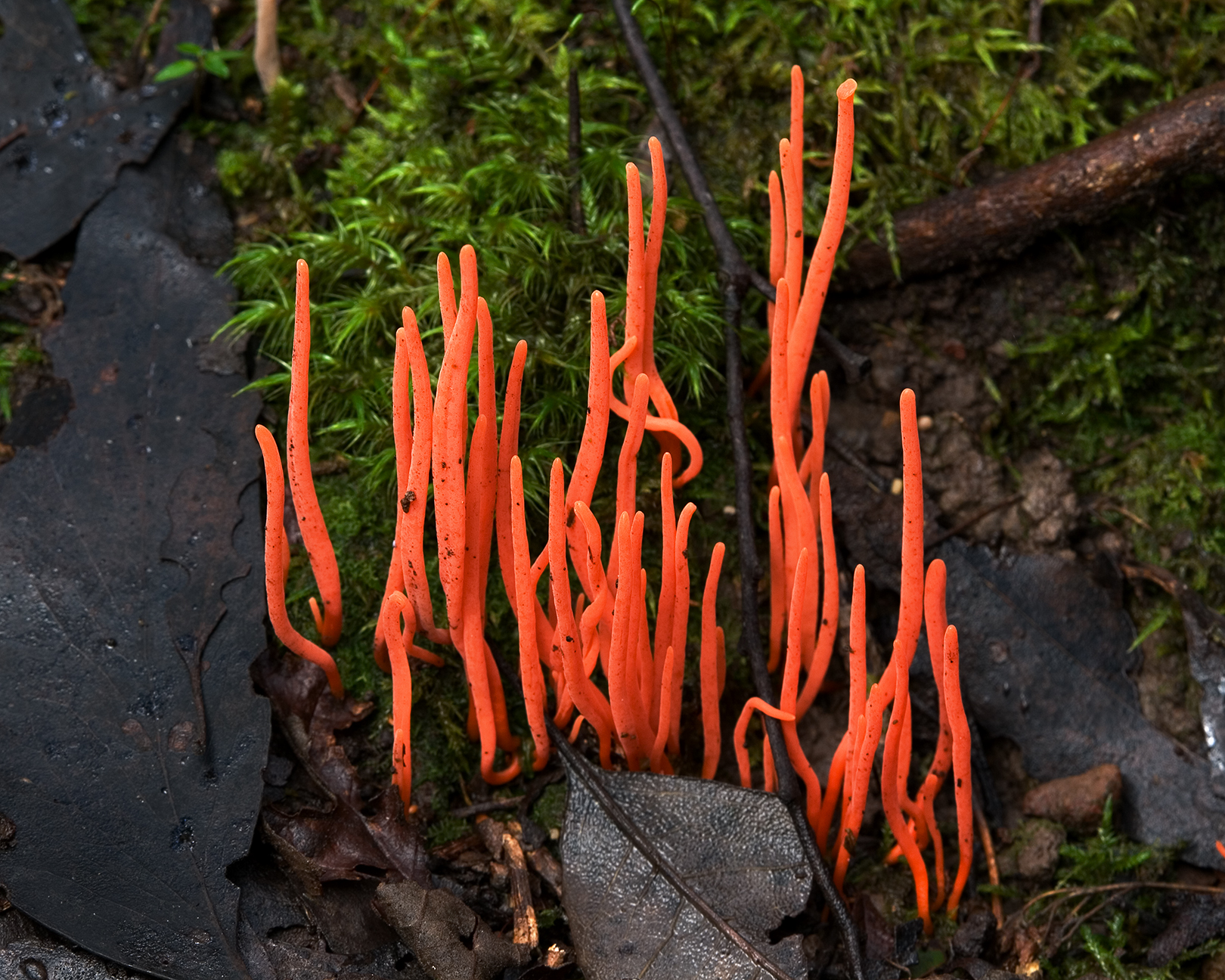 English: Clavulinopsis corallinorosacea (?) – An orange coral fungus (Clavulinopsis sulcata (miniata), order of Cantharellales) growing on forest floor in Mount Field National Park, Tasmania, Australia. |
