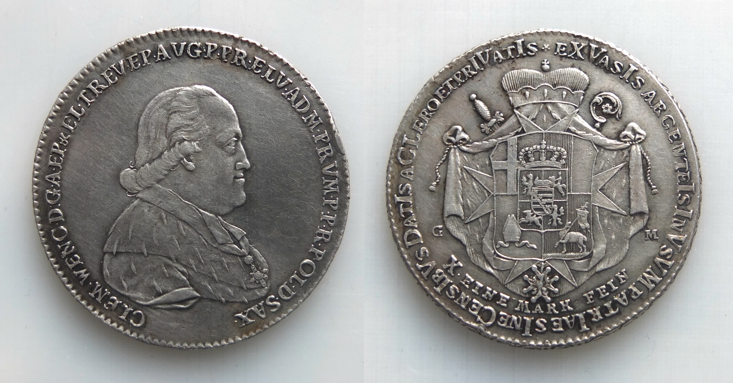English: Clemens Wenceslaus of Saxony (1739-1812), Archbishop and Prince-Elector of Trier, Kontributionstaler, coined 1794 in Trier. |