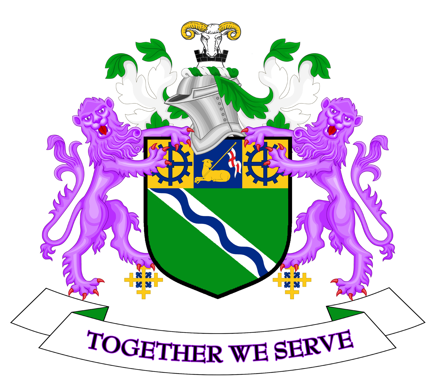 English: The Coat of arms of Kirklees Metropolitan Borough Council, the local government authority of the Metropolitan Borough of Kirklees, in West Yorkshire, England. The blazon is: ARMS: Vert on a Bend Argent a Bendlet wavy Azure on a Chief Or a Pale between two Cog-Wheels Azure on the Pale a Pascal Lamb supporting a Staff Or flying therefrom a forked Pennon Argent charged with a Cross Gules. CREST: On a Wreath of the Colours a Ram's Head affronty couped Argent armed Or gorged with a Mural Crown Sable masoned Argent. SUPPORTERS: On either side a Lion rampant guardant Purpure resting the inner hind leg on a Cross Crosslet Or embellished in each of the four angles with a Fleur de Lis Azure. |