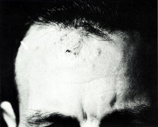 | Description | "Characteristic skin granulomata on the forehead. This patient also had a smaller skin lesion on the trunk and had roentgenographic evidence of pulmonary infiltration with hilar gland involvement." |
