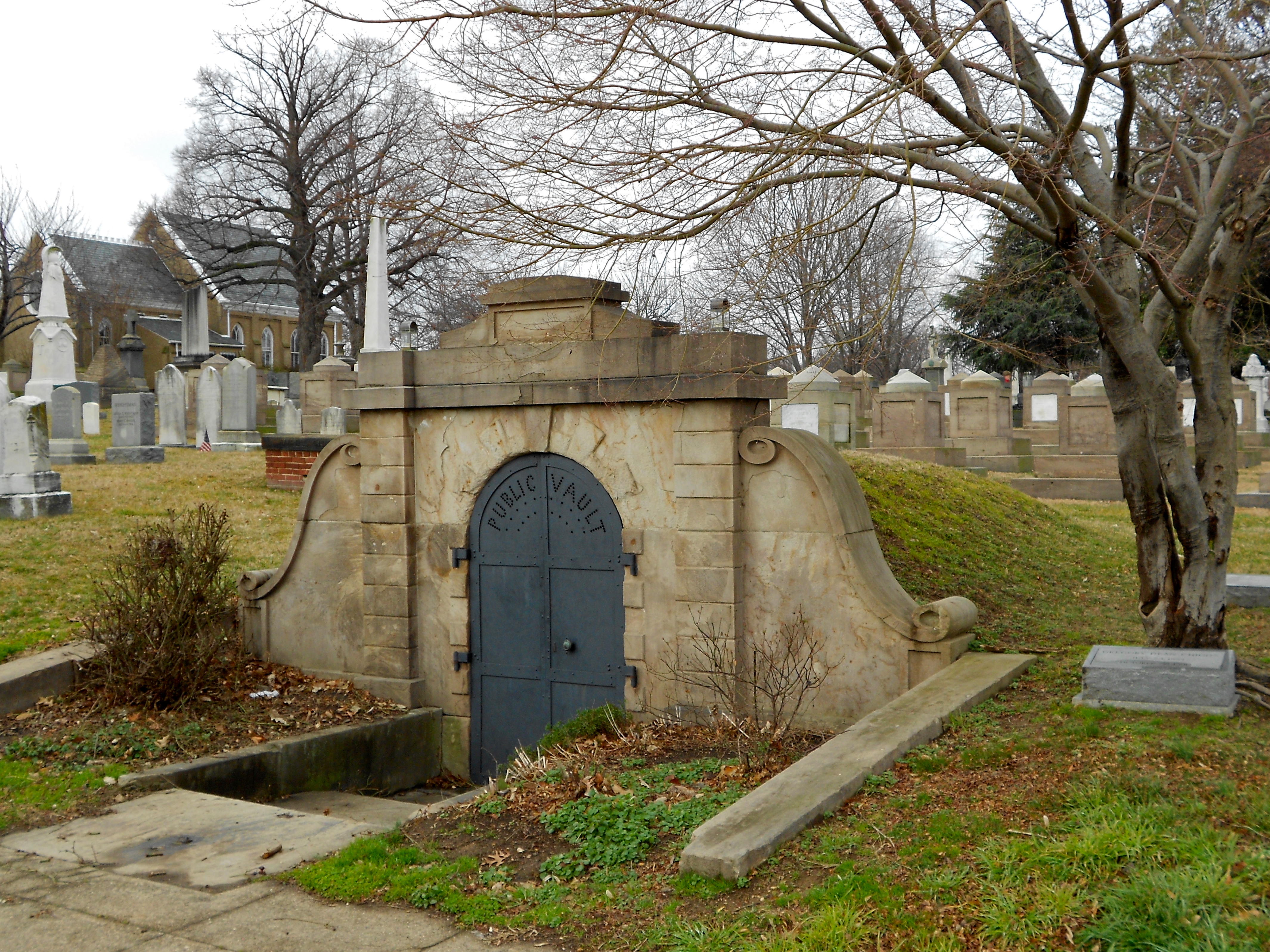 English: Grave in the Congressional Cemetery in Washington, DC, a National Historic Landmark. Public Vault. Photo taken in February when the outlines of the vault can be seen. |