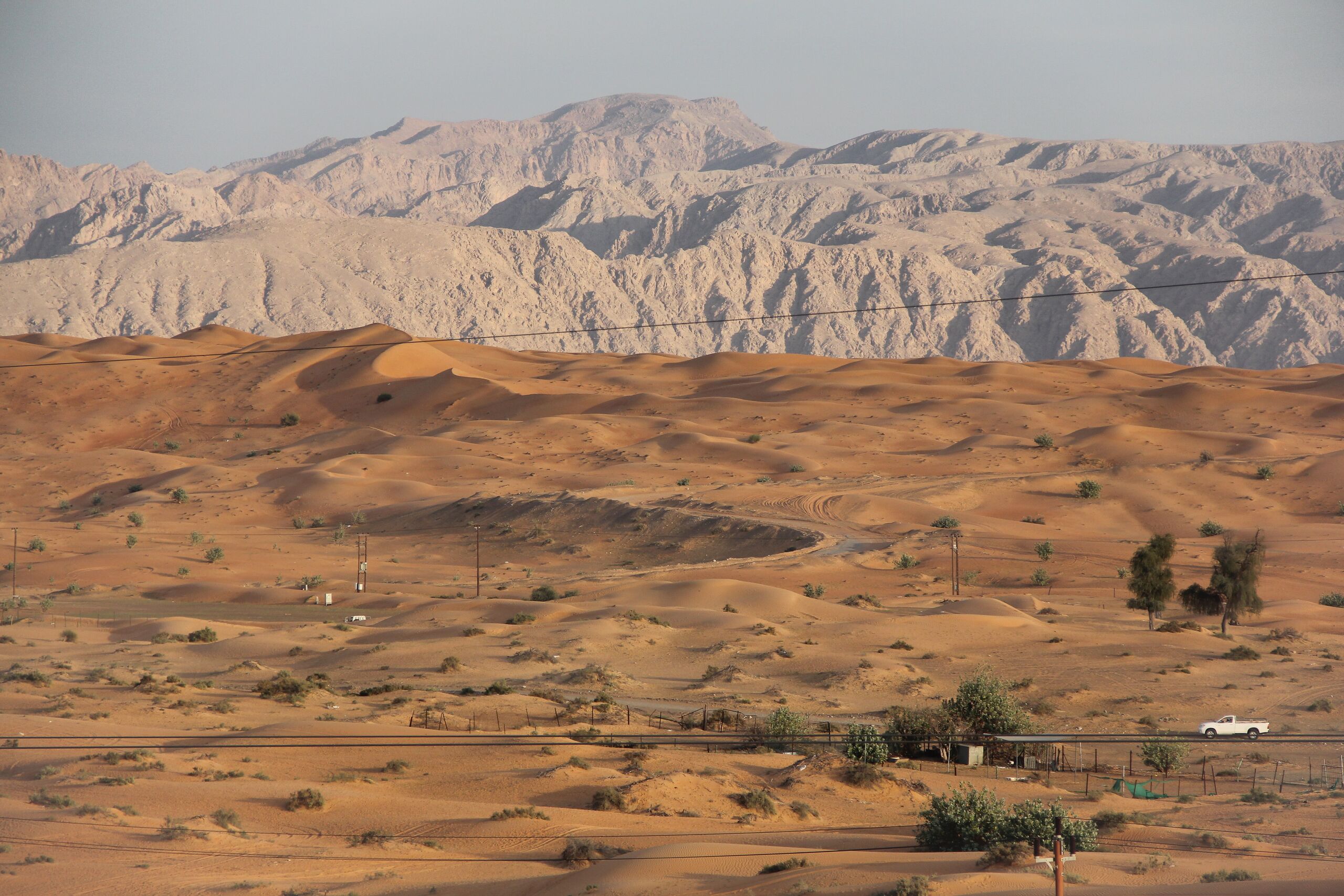 English: Contrasting Landscape between the Sharjah sand and the rock Omani Hajar Mountains |