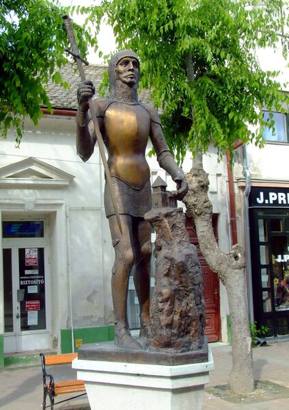 English: Statue of Ugrin Csák (?–1241) in Kalocsa. He was the archbishop of Kalocsa and died in battle of Mohi. Sculptor: Csilla Halassy (2000)
