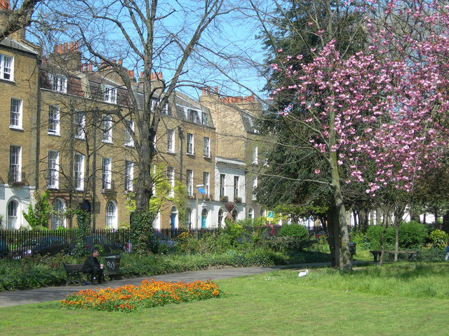 English: Clapton Square, Hackney, London. Showing the park and some houses on the road around it. |