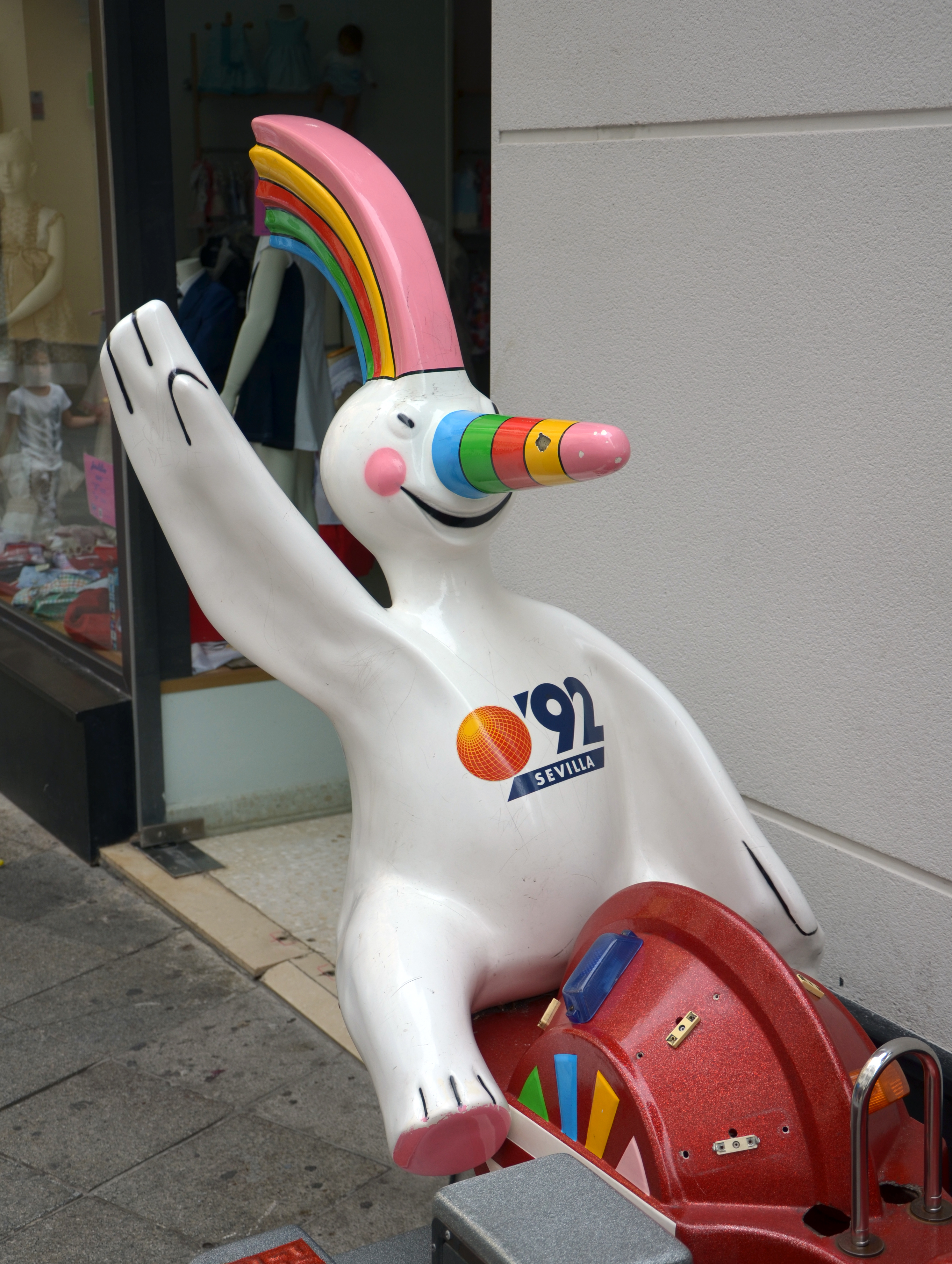 Français : "Kiddie ride" représentant Curro, la mascotte de l'exposition universelle de 1992, photographié dans la rue Francos de Séville (Espagne). Español: "Kiddie Ride" de Curro, la mascota de la exposición universal de 1992, en la calle Francos de Sevilla (España). |