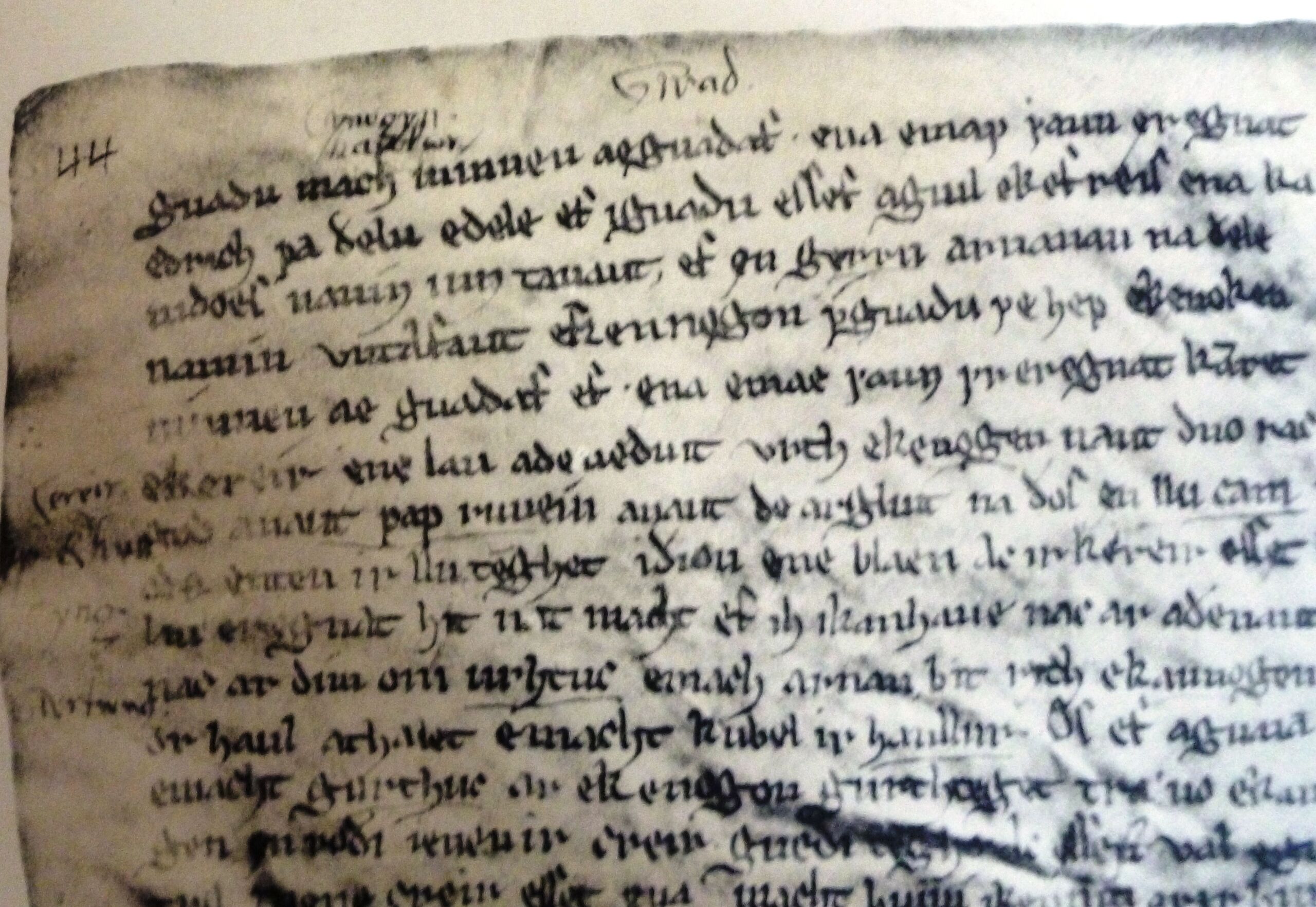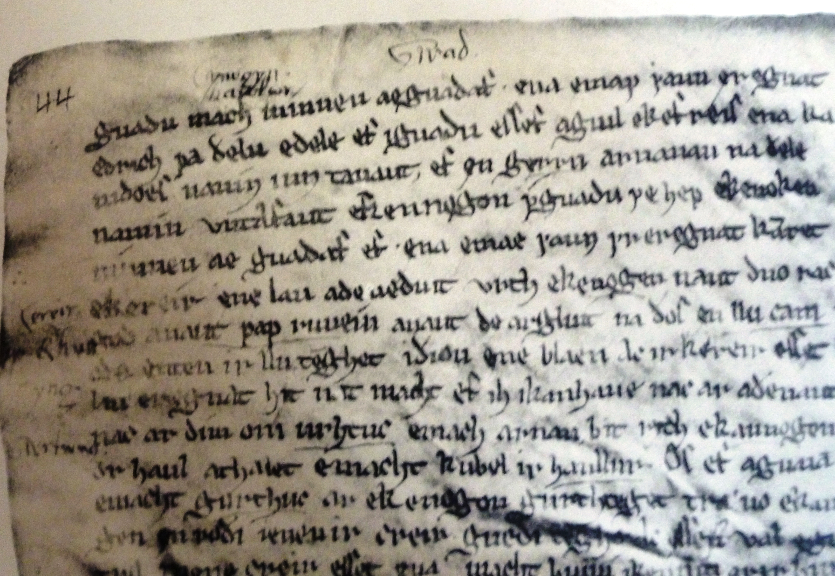 English: Close up photograph of page 44 of the book of Chirk (Llyfr y Waen) |