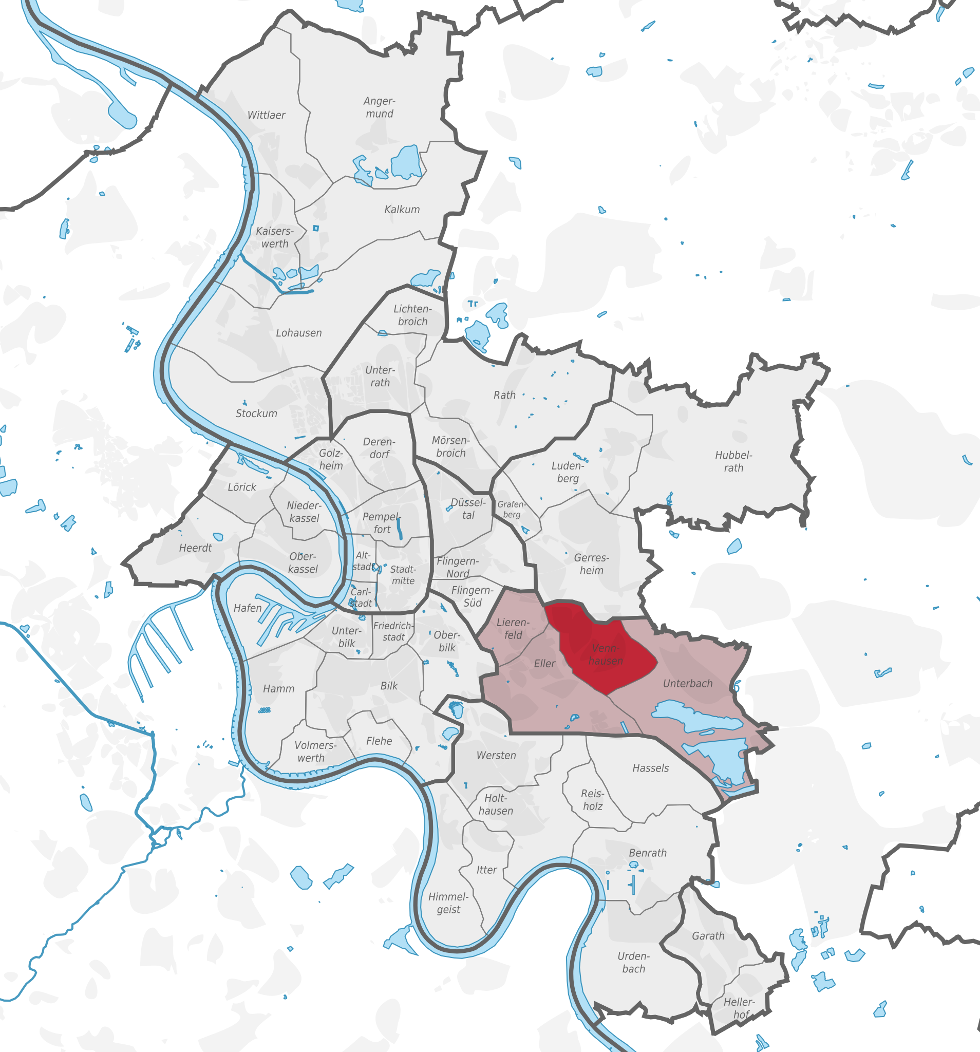 Deutsch: Lage von Stadtbezirk oder Stadtteil xy (siehe Dateiname) in Düsseldorf, Nordrhein-Westfalen