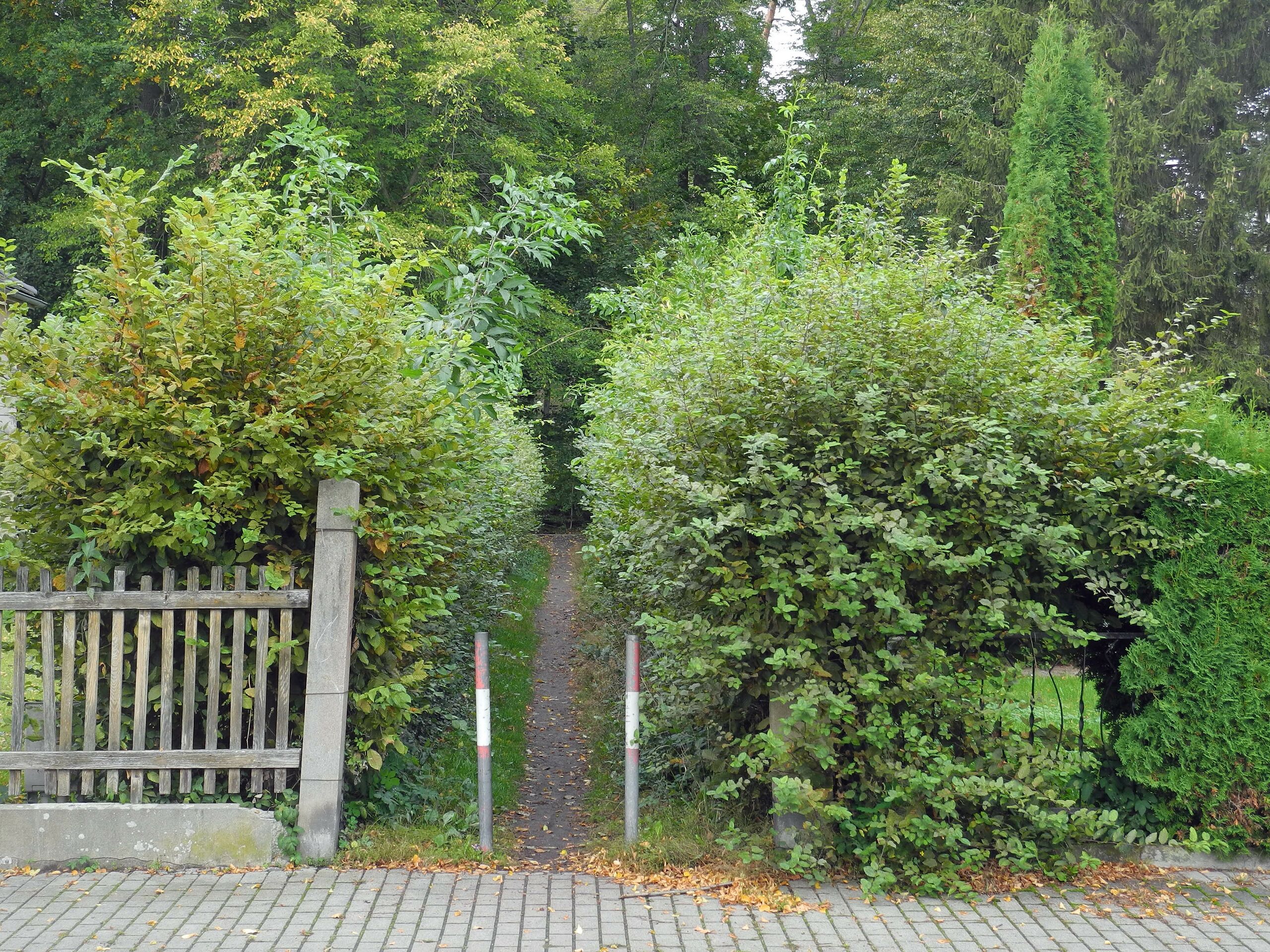 Deutsch: Der Juliusweg in Dresden-Bühlau beginnt zwischen der Großschönauer Straße 33 und 35 und führt in die Dresdner Heide (benannt nach dem Buchdrucker Julius Walter Meinhold). |