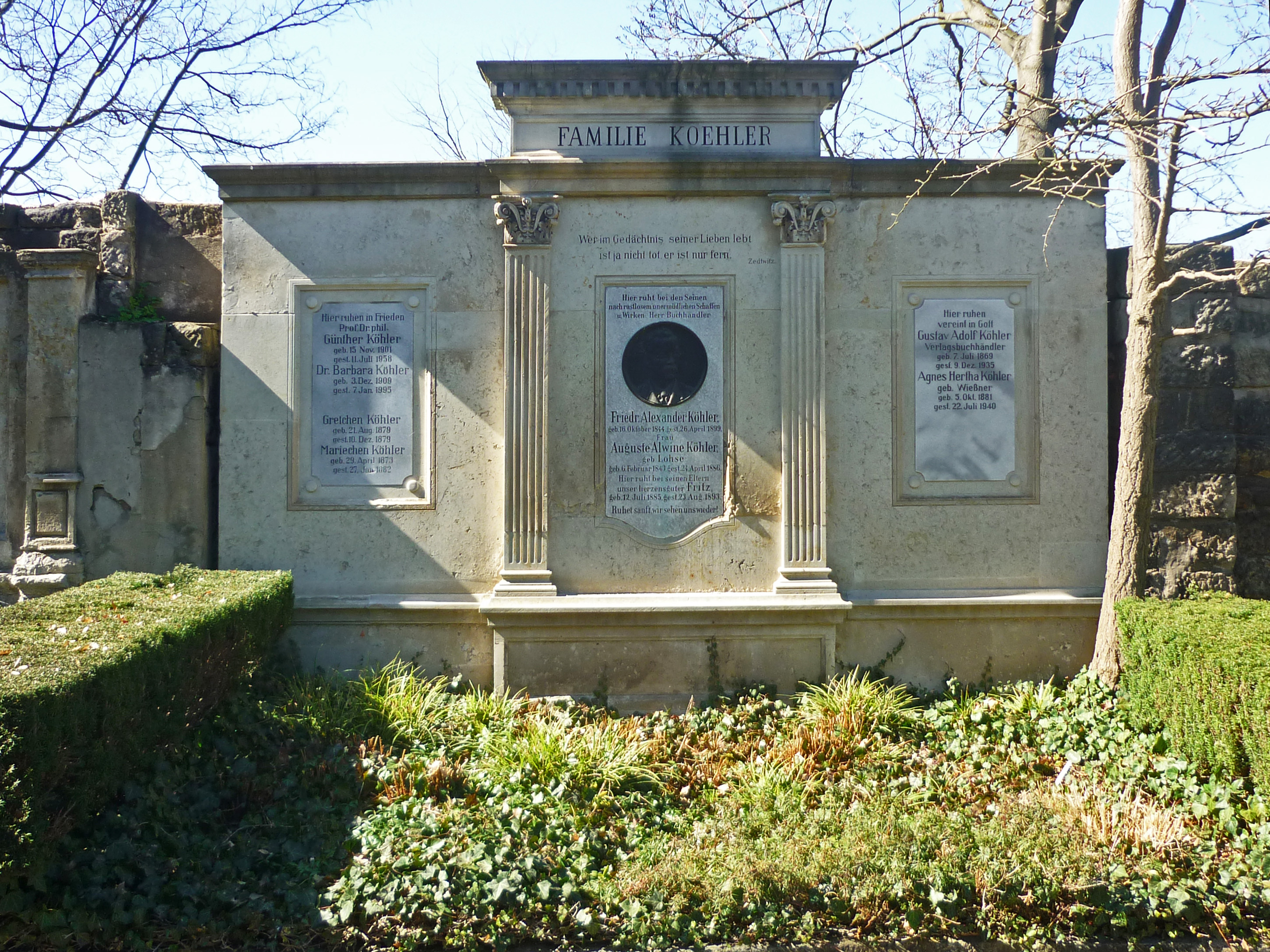 Deutsch: Grabstätte von Friedrich Alexander Köhler (1844–1899), Gründer der Verlagsbuchhandlung Alexander Köhler (gegr. 1869 in Dresden) auf dem Trinitatisfriedhof in Dresden |