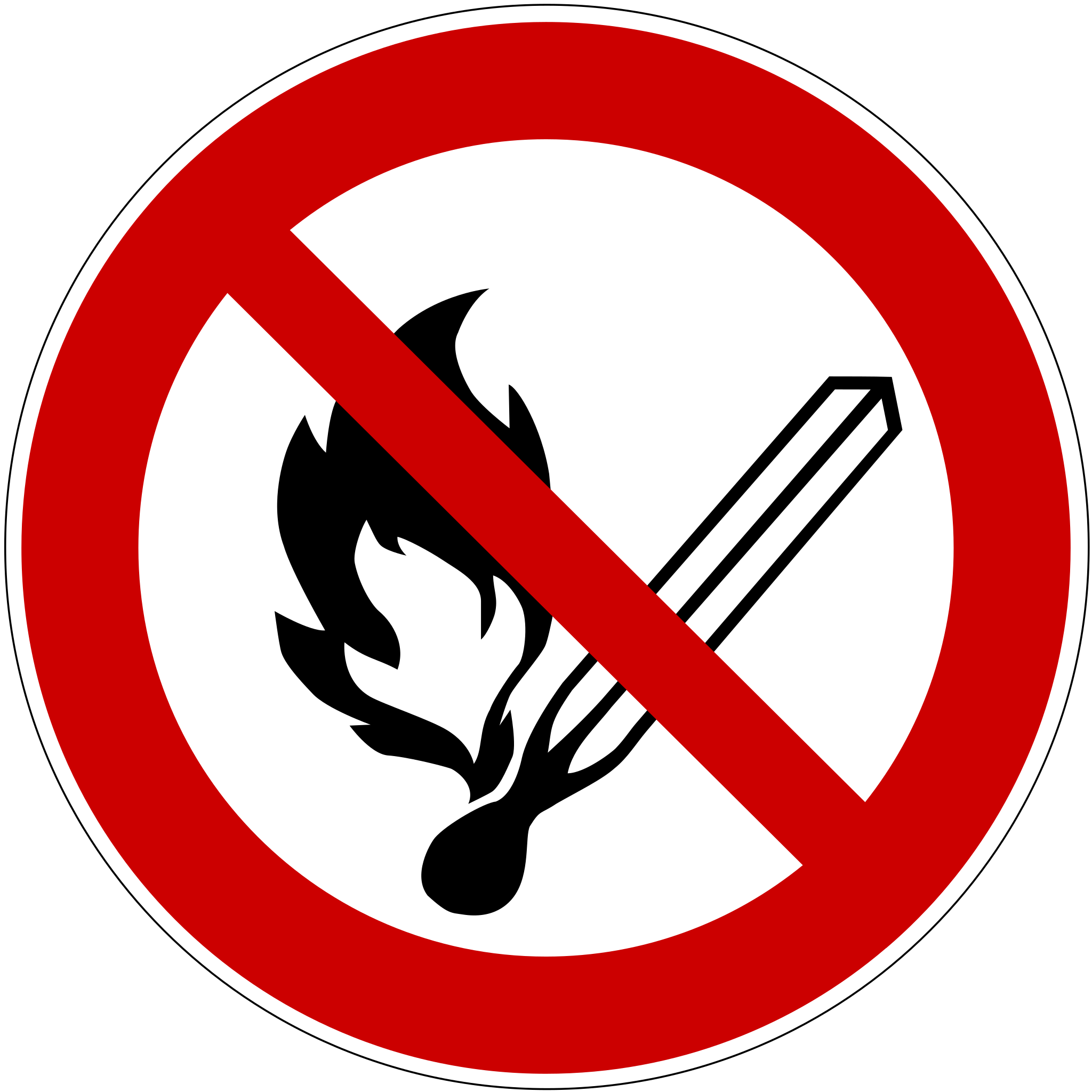 English: Prohibition sign No Fire, No Smoking Deutsch: Verbotszeichen "Feuer, offenes Licht und Rauchen verboten", Symbol D-P002 nach DIN 4844-2 |